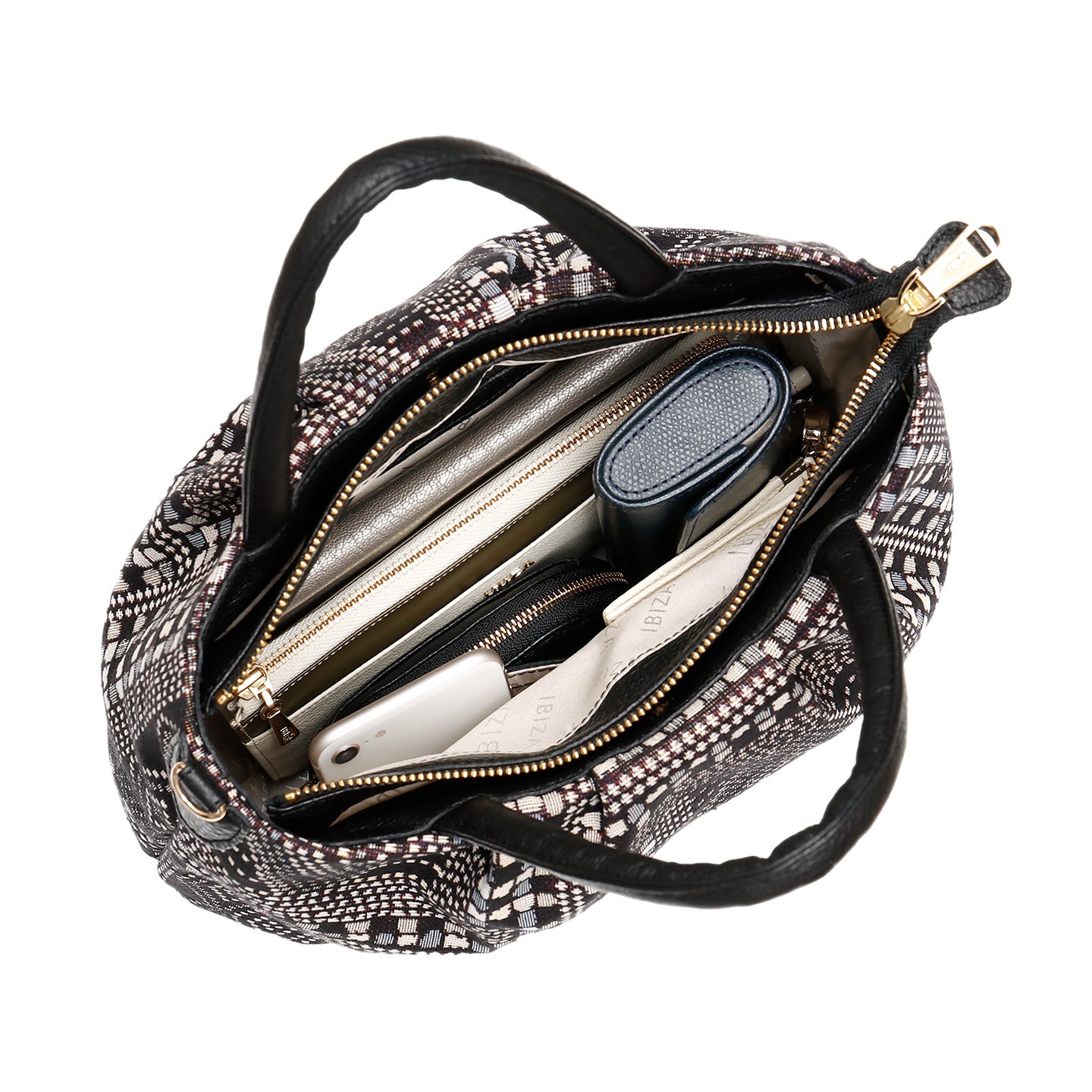 丈夫でありながら軽さが魅力のスペインフラウペレス社のゴブラン織り。繊維産業が盛んなバレンシア州アリカンテで40年以上の歴史を持ち、イビサではすでに20年近く扱っている信頼のテキスタイルメーカー、フラウペレス社のファブリックを採⽤しました。精密な柄の美しさに加え、しっかりと地厚で、⻑繊維で織られているため擦れても⽑⽻⽴ちが少ない点など、強度的にもバッグに適した素材です。イビサらしくレザーを配することできちんとしたバッグの印象を保ちながら、手にして驚くのは持っていることを忘れるほどの軽さ。それが叶うのはこのレザーのあしらい方にもあるのです。よく手にするハンドルやショルダー紐にレザーを施すことでリペアを可能にしました。いいものを長く使っていただきたいという想いを込めています。