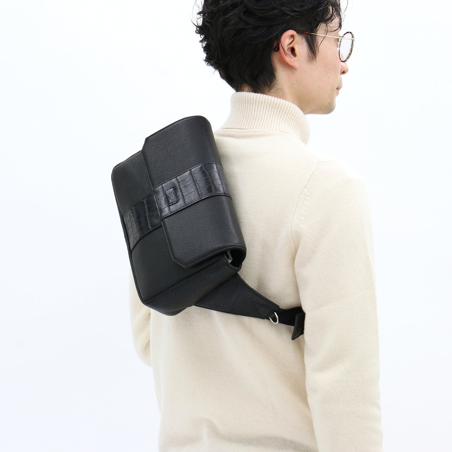 素材には、北米産の天然シュリンクレザーを使用。やわらかい革なので、長時間背負っていても体に当たる部分が痛くなりにくく、快適に使うことができます。また、クロコダイル型押しの部分についても、クロコダイルの「腑」がより美しく見える素材を選定。型押し素材に艶感を出す手間を加えるとともに、染色で濃淡をつけることで立体感を出しています。