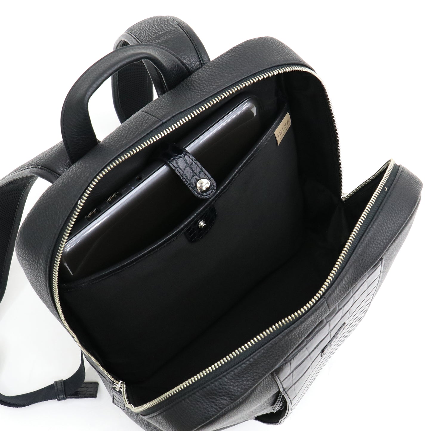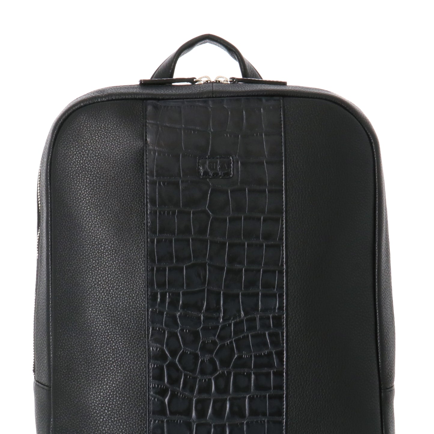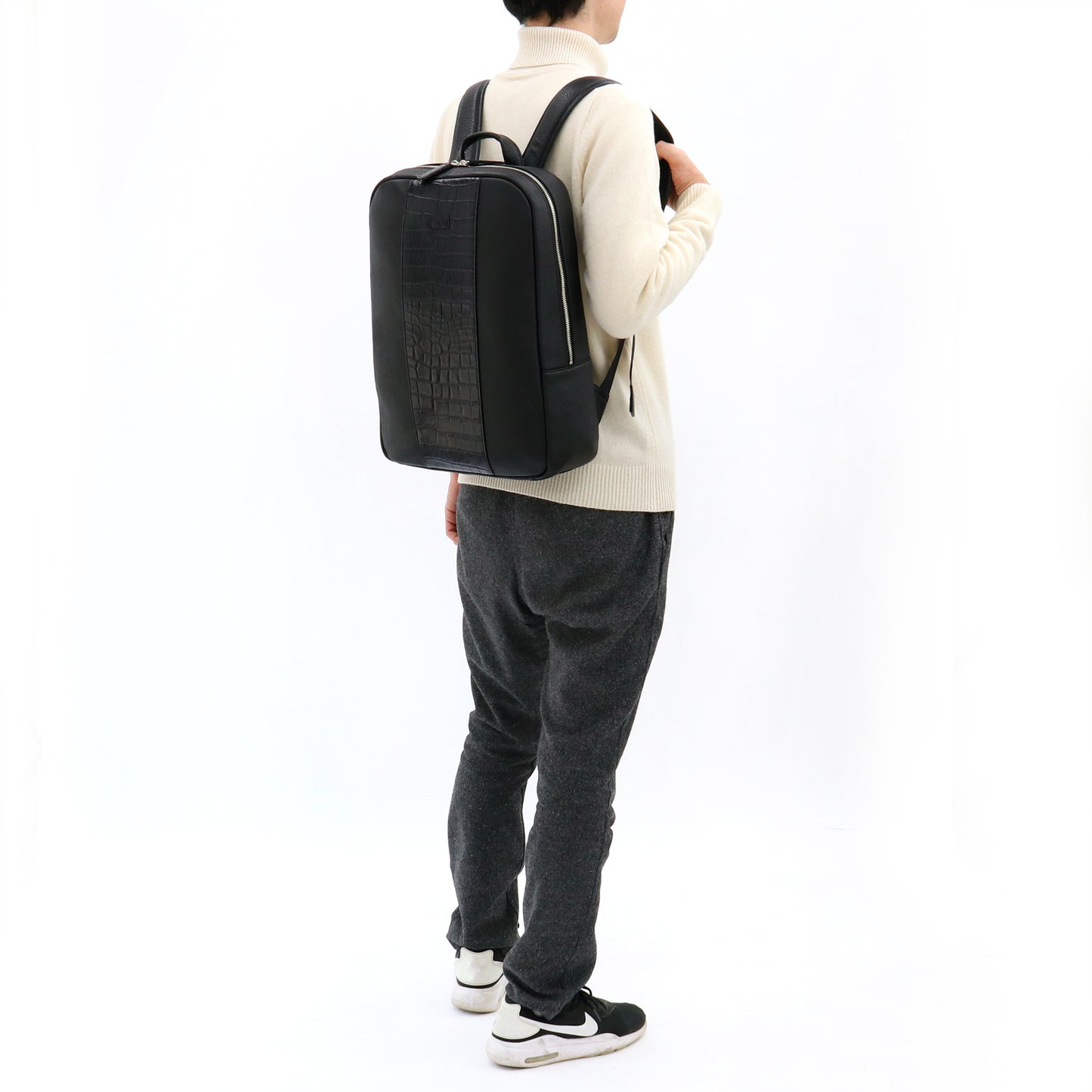 やわらかみのある北米産のシュリンクレザーに、クロコダイル型押しを施した縦ラインのレザーを組み合わせ、シンプルでありながら印象に残るデザインに仕上げました。また、アウトラインをスクエア型にすることで、よりシャープで優雅な雰囲気に。ビジネスシーンでもプライベートでも活躍するバックパックです。