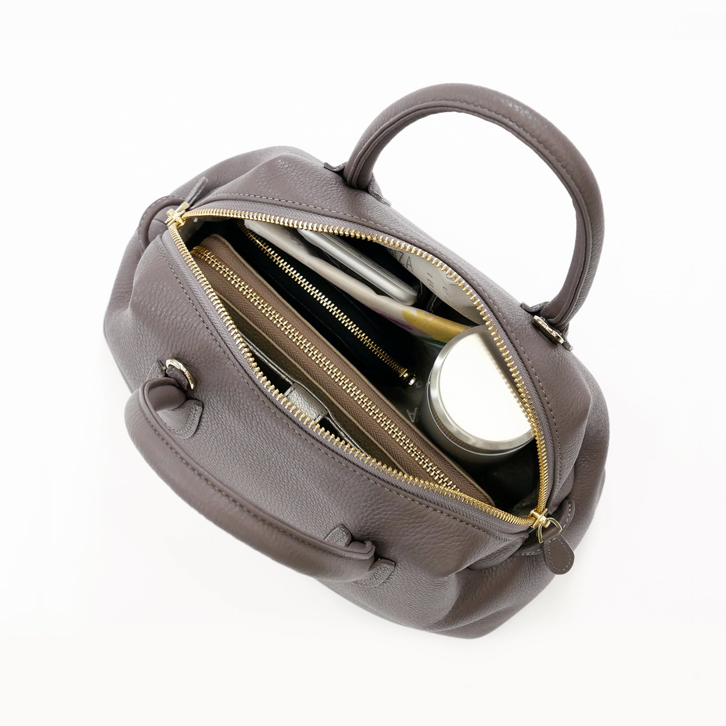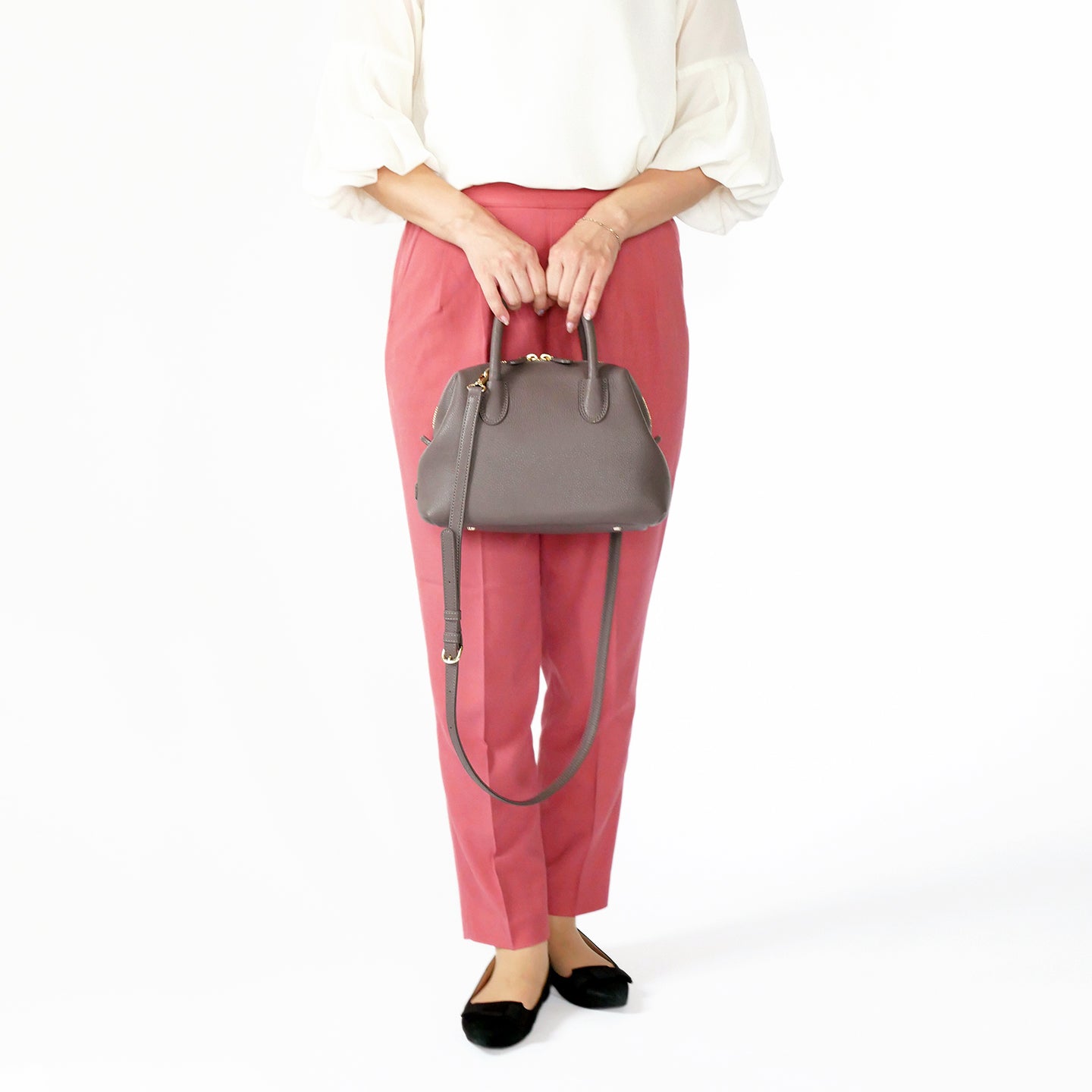 コンパクトな見た目ながら、2WAYで使える機能性と、ダブルファスナー式で大きく開くメインスペースは適度な深さがあり、手帳や長財布、ポーチ、350mlのボトルが収まる実用的なサイズです。ファスナーの開閉時に指をかけられるリングなど細かな機能性にもこだわりました。必要なところの金具も極力目立たない小ぶりな物を使用しています。