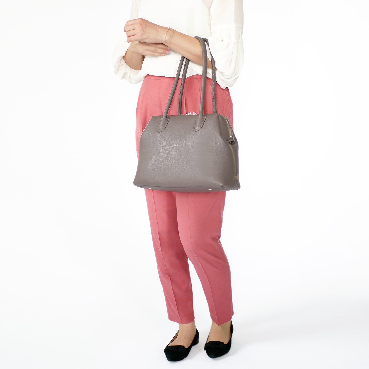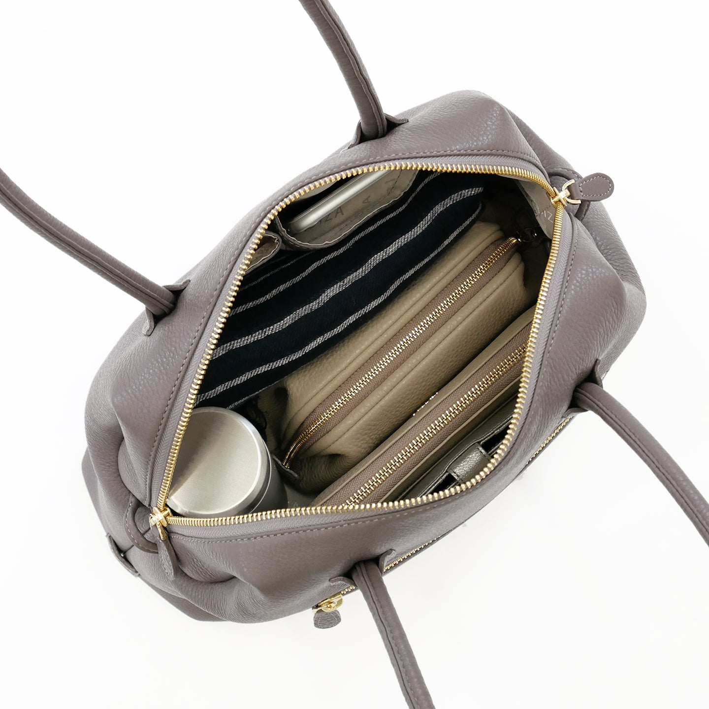 肩にかけた時の収まりがよく、体に自然とフィットするセミショルダーバッグ。ダブルファスナー式で大きく開くメインスペースは適度な深さがあり、B5サイズのファイルや長財布、ポーチ、折り畳み傘、ストールが収まる実用的なサイズです。ファスナーの開閉時に指をかけられるリングなど細かな機能性にもこだわりました。