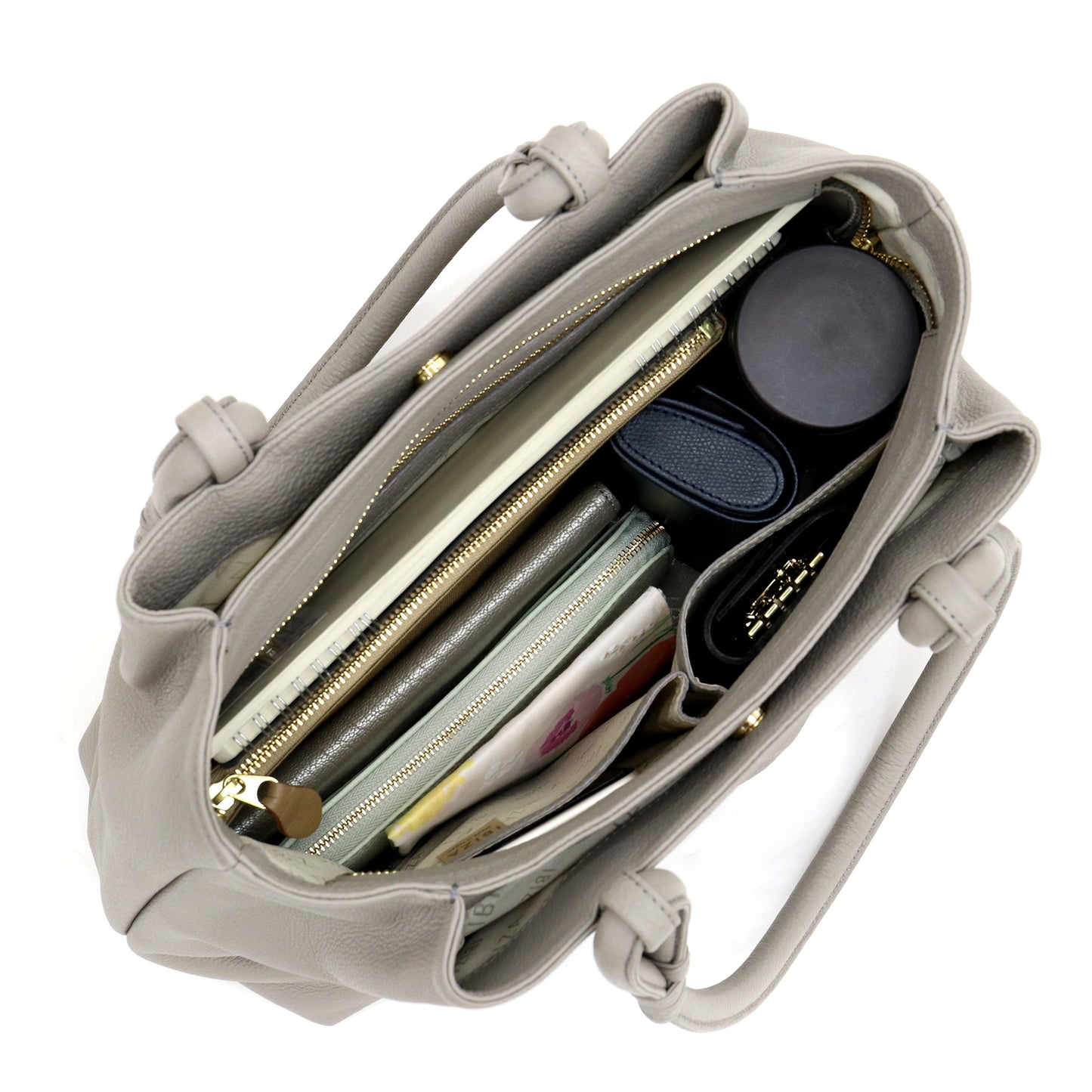 肩に掛けたときバランス良く収まるセミショルダーバッグは、A4サイズもすっきり収納できるサイズ。ハンドルの長さは、肩にかけたままでも荷物の出し入れがしやすいよう計算されています。口開きがよく、ファスナーを開けた状態でオープンタイプとしてもお使いいただけます。
