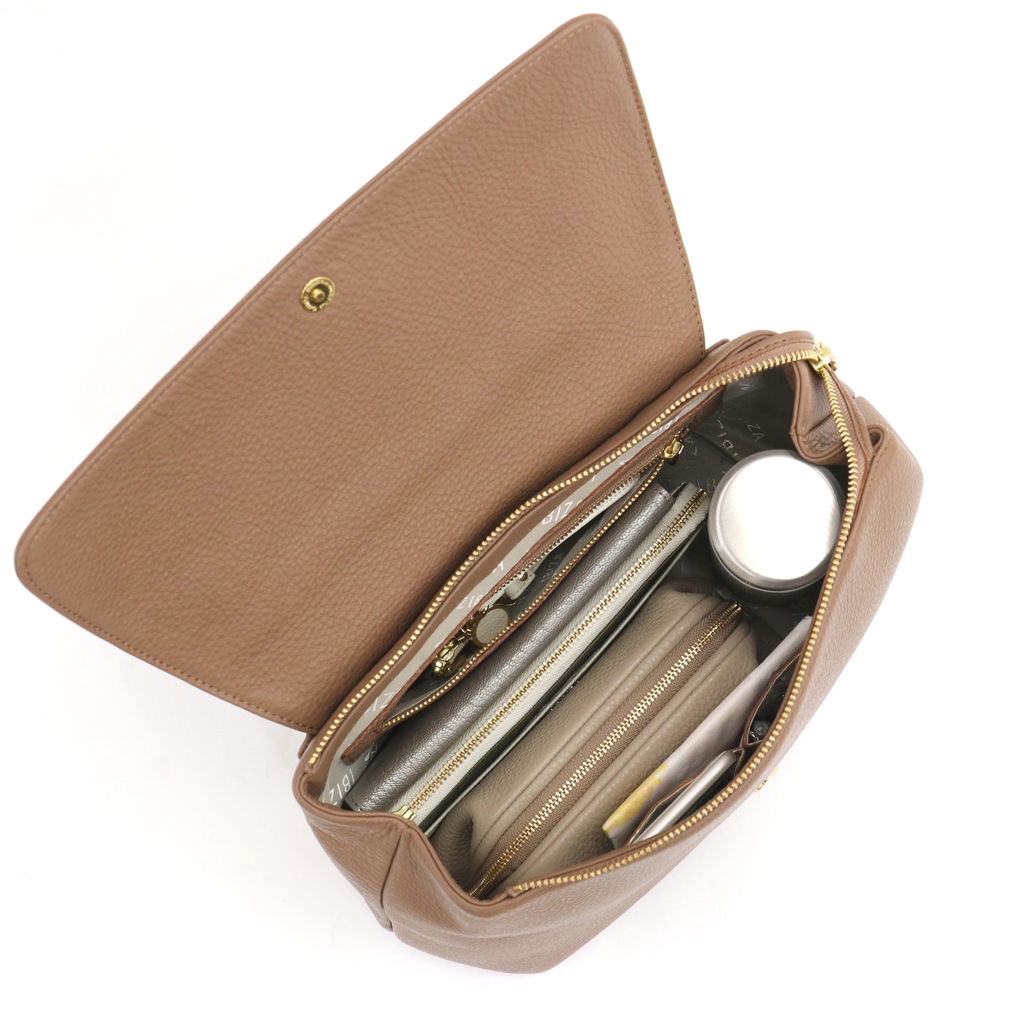 必要なものがしっかりと収納できる実用的なサイズの2WAYショルダーバッグ。メインファスナーを開けた状態でも、マグネット式のかぶせが付いているので安心してお使いいただけます。内側には、ファスナーポケットやオープンポケットがあるので整理整頓がしやすく、細かなものもきちんと収納できます。スマートフォンやパスケースなどすぐに取り出したいものの収納に便利な後胴のファスナーポケットは、洋服を傷めないようレザーガードが付いていて細かなところまで配慮したデザインです。