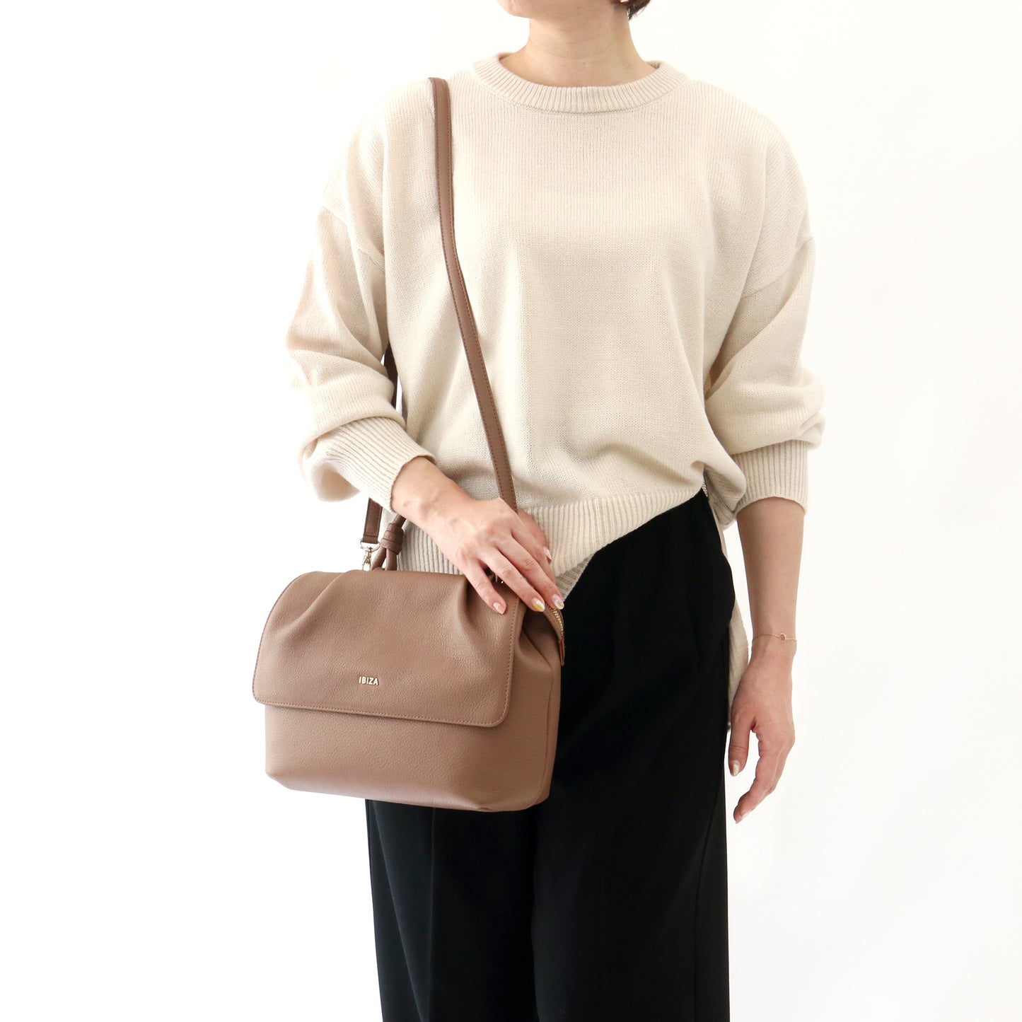 肩にかけたときのバランスや使いやすさを考えてつくられた2WAYショルダーバッグ。クラフト感のあるデザインがポイントのハンドルは、ストレスなく倒れる仕様になっているので、肩にかけたときも邪魔にならずお使いいただけます。