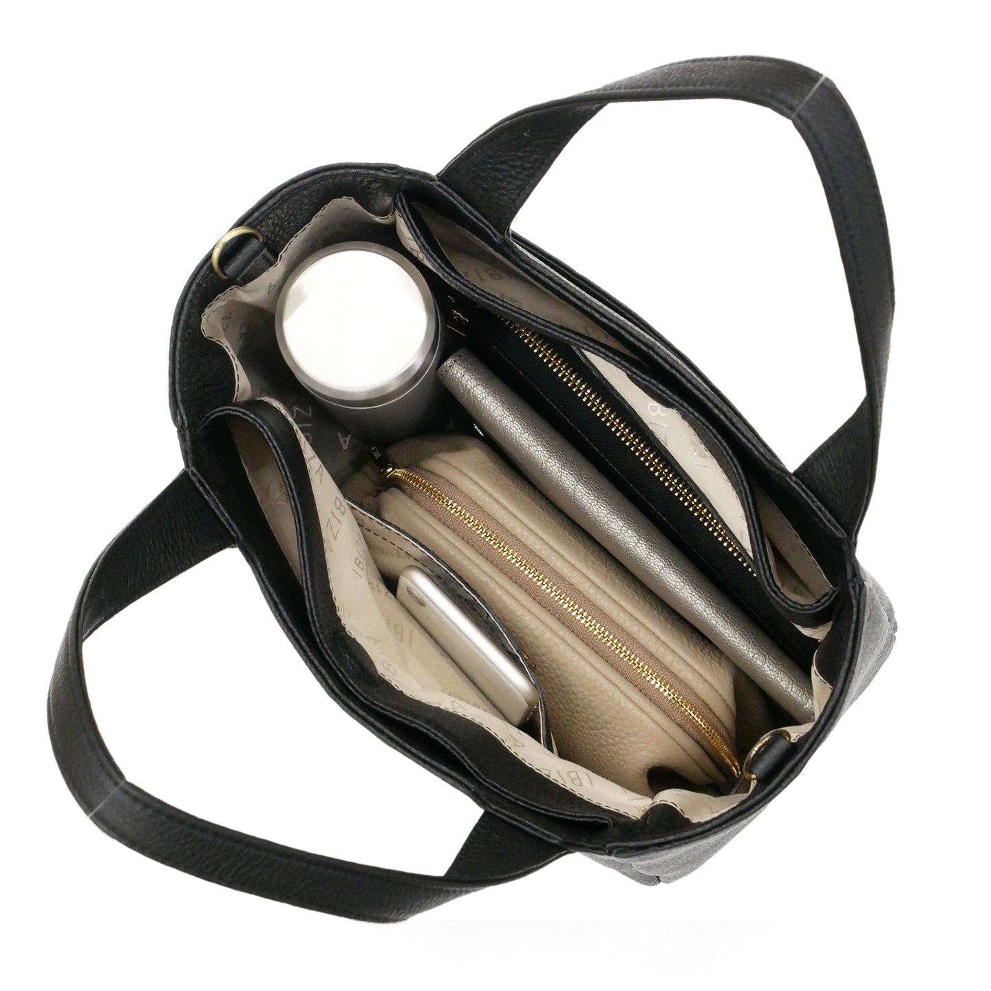 広めのマチ幅で収納力あり、お出かけに必要なものがしっかり収まります。開口部はマグネット式オープンなので、バッグの中身もひと目でわかり荷物の出し入れもスムーズに行なえます。前後のあおりポケットや背面のオープンポケットはよく使うものを収納いただけます。