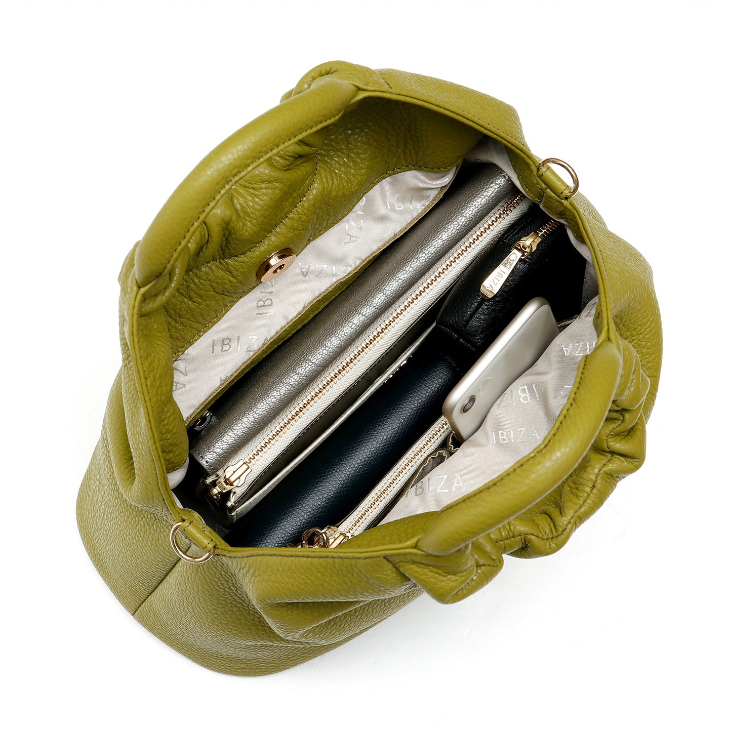 スタイルによって持ち方を変えられる2WAYバッグ。ショルダー紐は本体より取り外しができるので、シーンに合わせてお使いいただけます。素材のやわらかな表情を演出する口元のギャザーと、手馴染みが良くふっくらしたハンドルがポイント。女性らしいスタイリングにも、あえてマニッシュなスタイリングのワンポイントにも取り入れられるアイテムです。