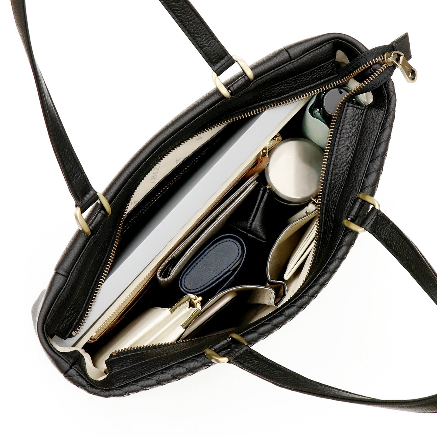 A4サイズがしっかり収まるセミショルダーバッグ。バッグの内側にもポケットを充実させ、細かなものも整理整頓して収納いただけます。さらに、背面のオープンポケットは、内側にもポケットを付け、スマホやパスケースなどよく使うものの出し入れにとても便利。メッシュではなく一枚革にすることで服への摩擦を軽減し、ストレスなくお使いいただけます。