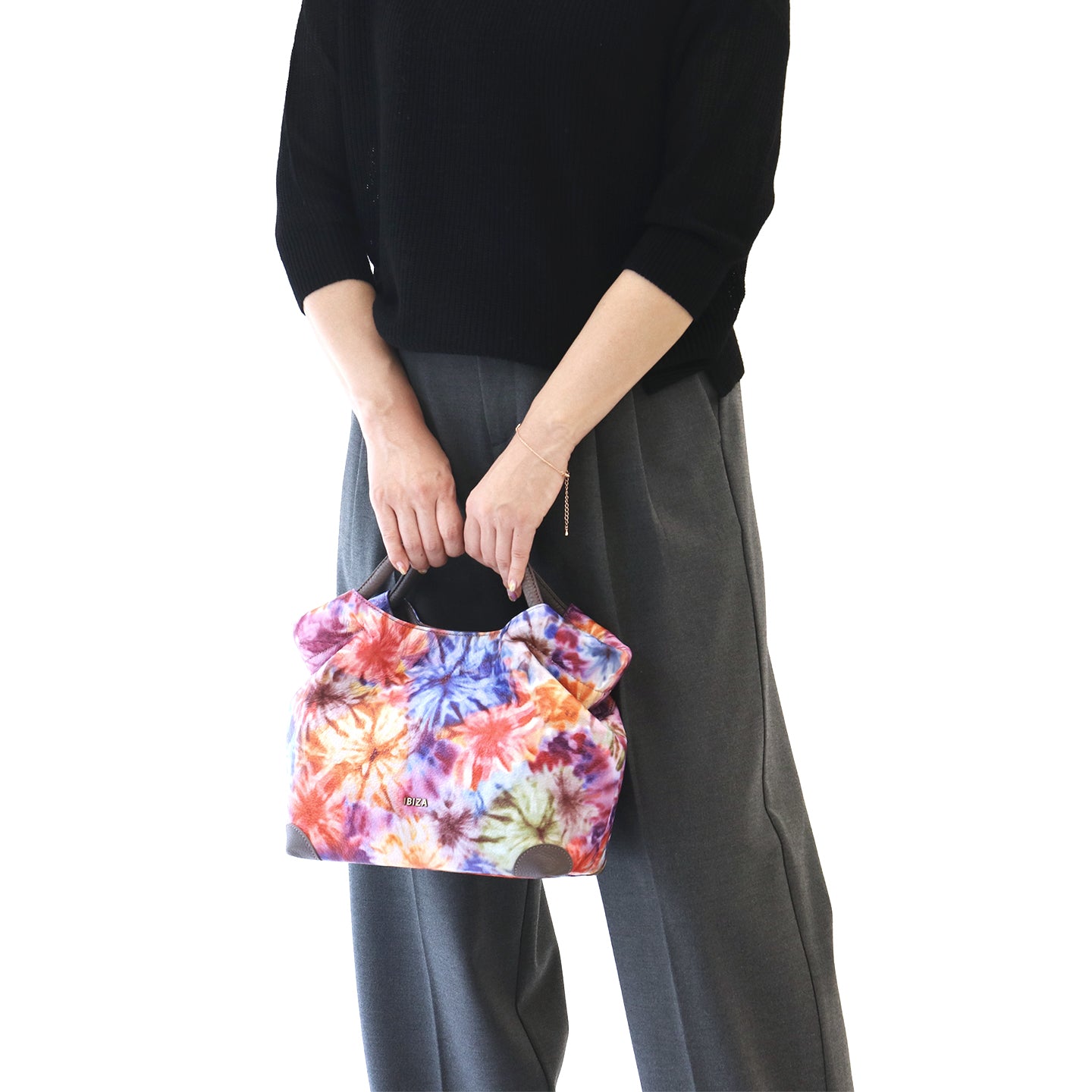 シーンに合わせて持ち方を変えられる2WAYバッグ。やわらかな素材ですが、広めのマチ幅なので置いたときも型崩れせず自立します。ハンドルはイビサで長年愛されている丸手タイプを採用し、長時間持ち続けても疲れにくいつくりにしました。花束を手にしているような華やかさを添えてくれるアイテムです。