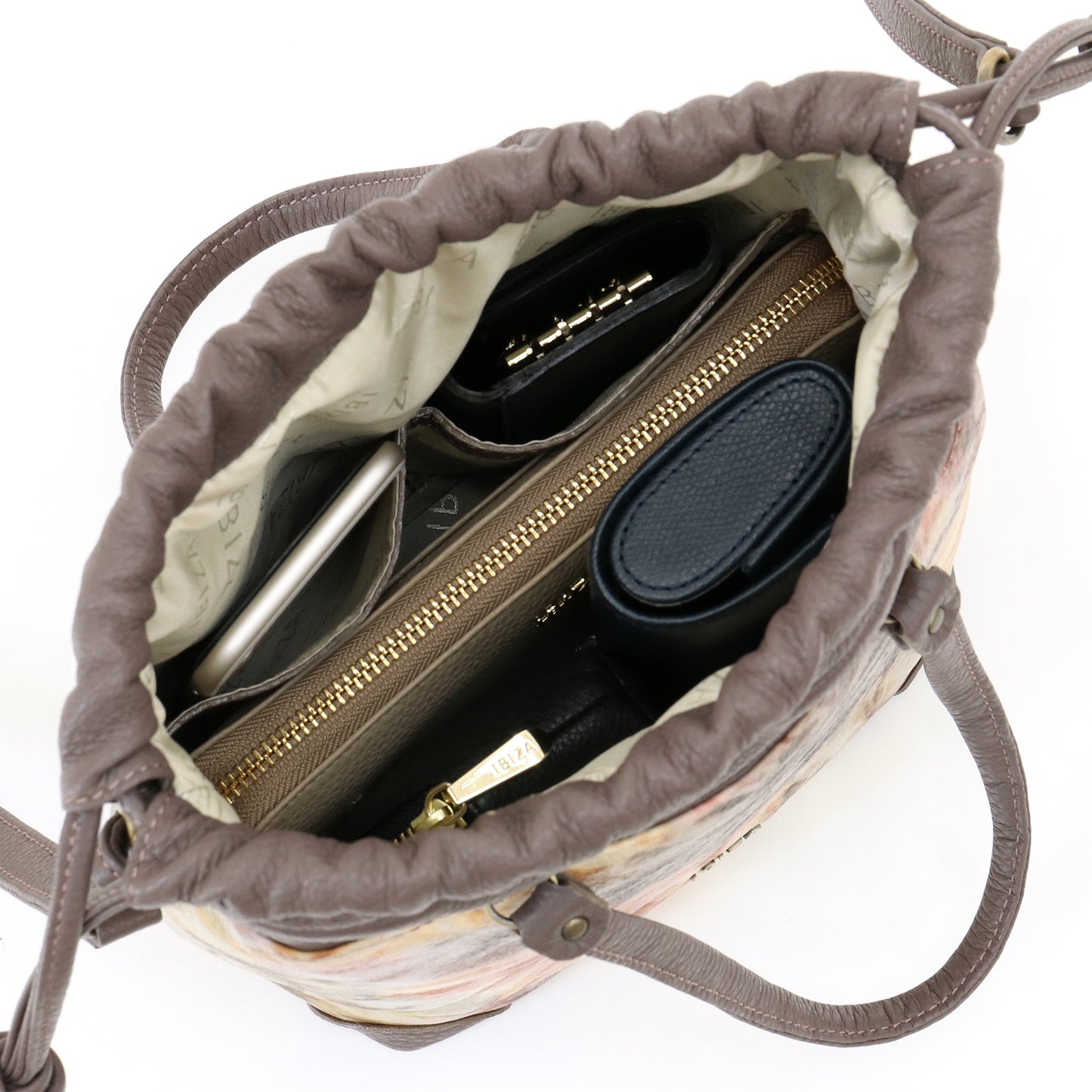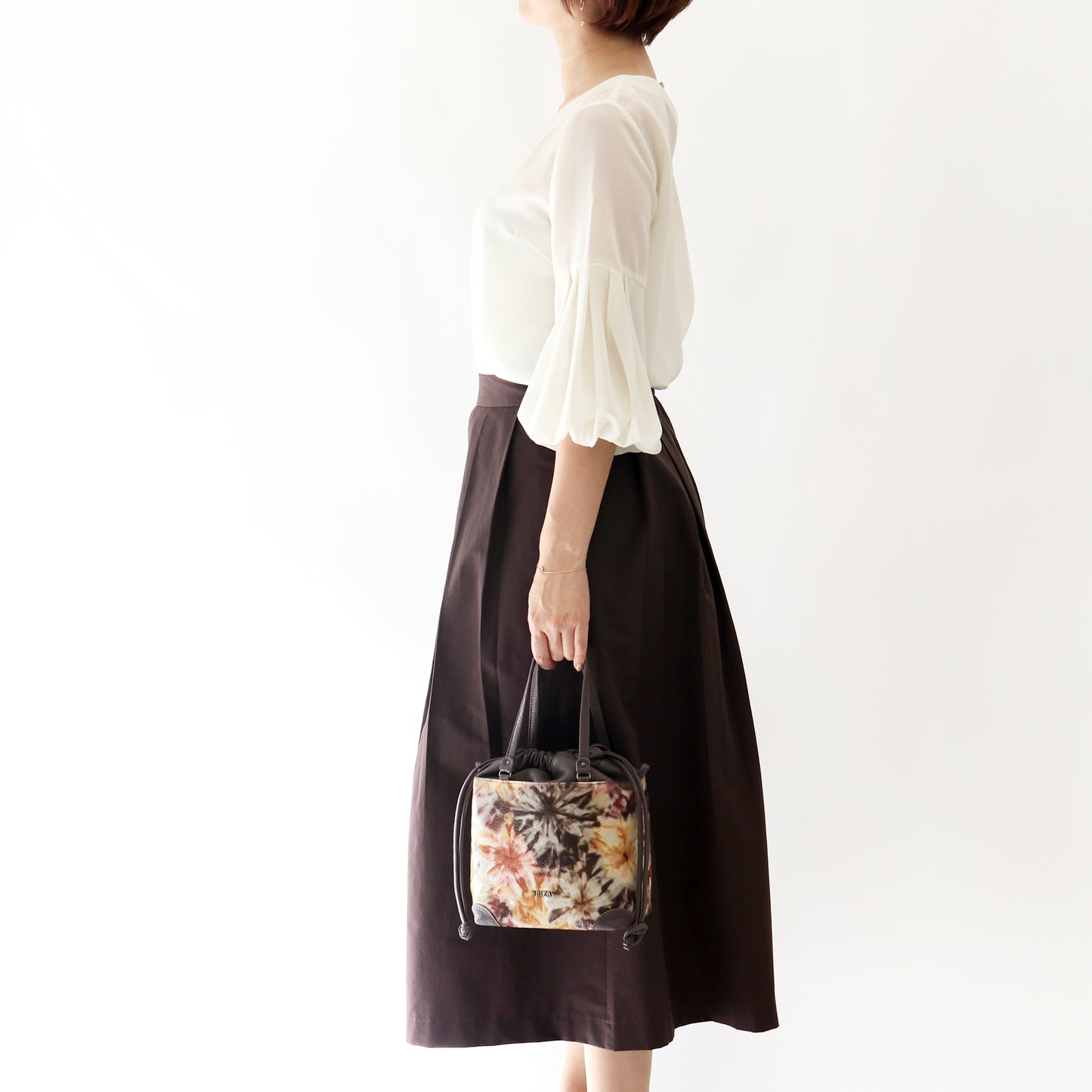 アクセサリー感覚で持てる2WAYショルダーバッグ。やわらかな素材ですが、広めのマチ幅なので置いたときも型崩れせず自立します。ショルダーストラップは取り外しができ、小ぶりなハンドバッグとしてもお持ちいただける可愛らしい巾着タイプ。絞らずにバッグの内側に落としてオープンタイプとしてもお使いいただけるので、荷物の出し入れもスムーズに行なえます。花束を手にしているような華やかさを添えてくれるアイテムです。