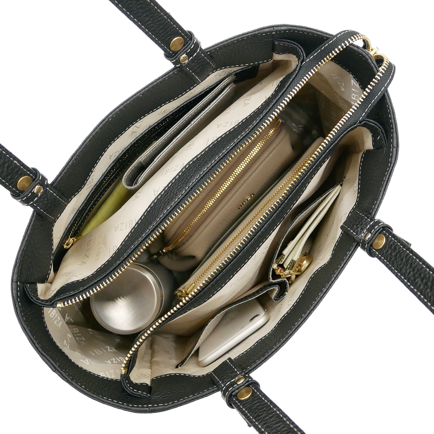 A4サイズ対応のメイン収納は、ファスナー式で貴重品等もしっかり収まる安心のつくり。前後に配したあおりポケットは広めにデザインされており、ポケットも充実しているので、よく使うものも仕分けして収納することができ便利にお使いいただけます。