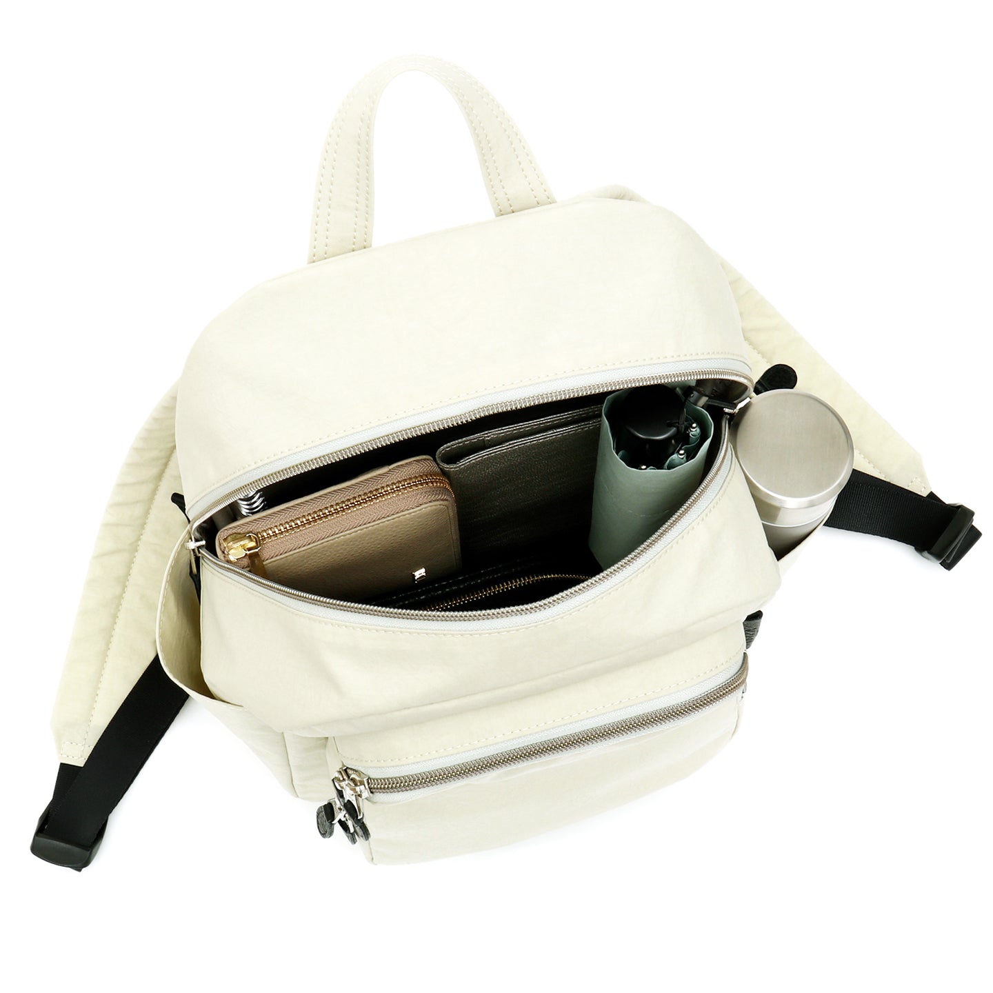 フロントの立体ポケットは、携帯や二つ折り財布もすっきり収まる絶妙なサイズ感。両サイドにはペットボトルや折り畳み傘を、背面にはキャリーベルト付きの大きなポケットを備え、旅のお供にもおすすめ。内装もポケットが充実しており、自然と整理上手になれる設計です。