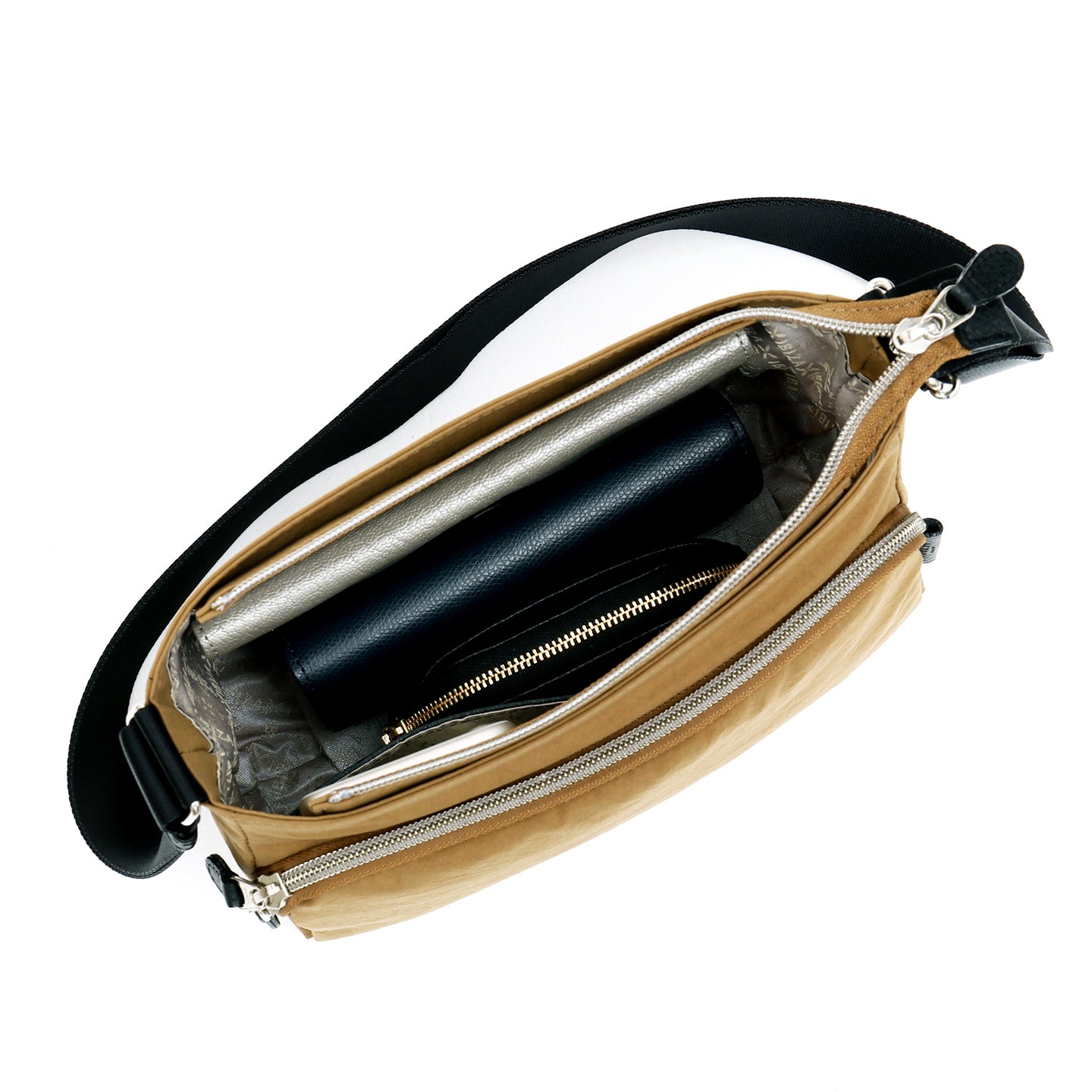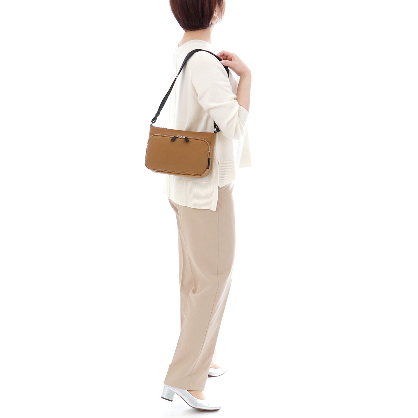 小ぶりながら立体的なフロントポケットと背面ポケットを備え、本体は安心感のあるファスナー仕様。必要なものをスマートに持ち歩けて、毎日の「ちょっとそこまで」にピッタリな、軽快で頼もしい存在です。