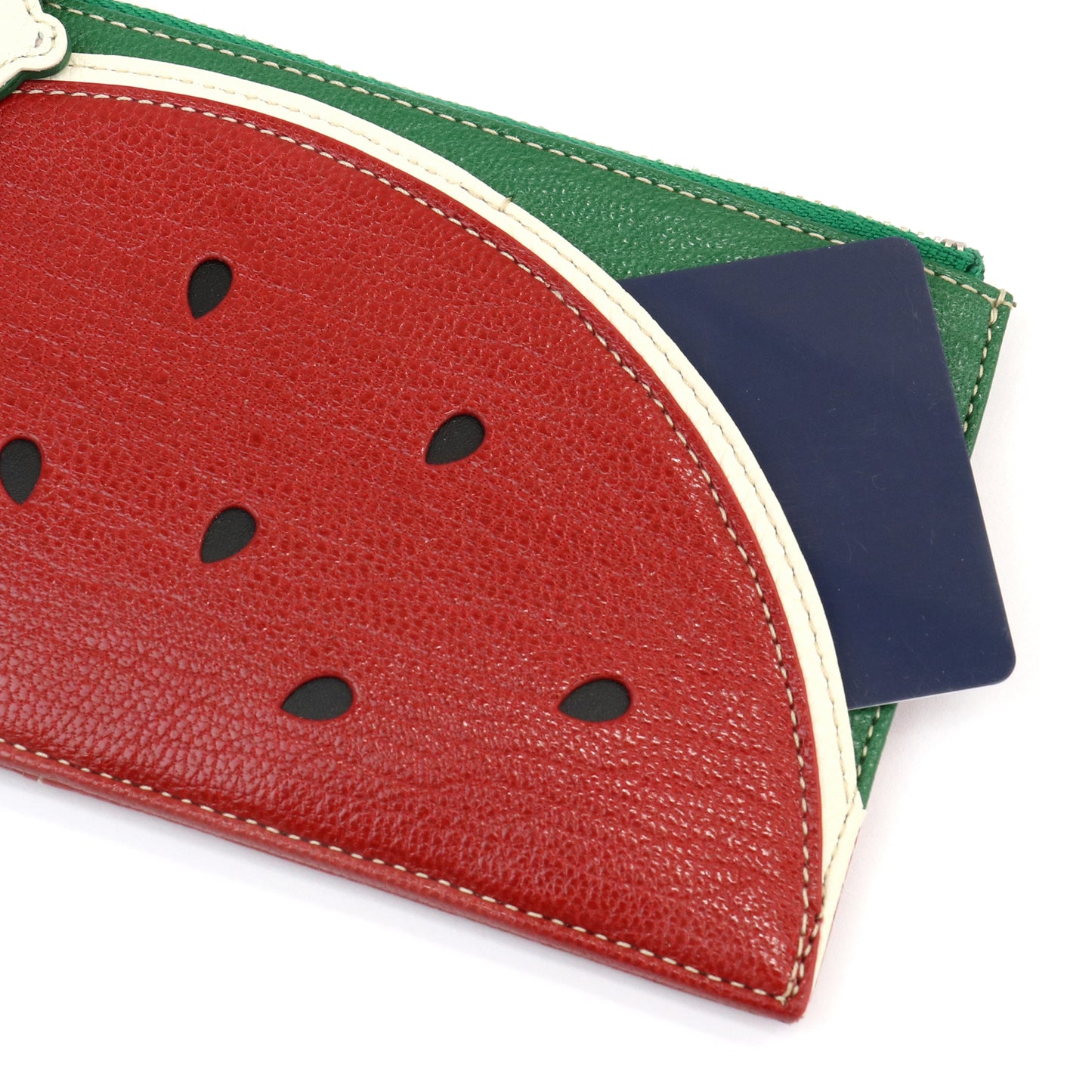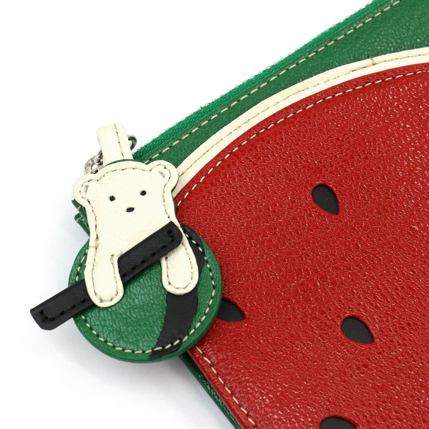 正面の半円フルーツモチーフ部分はカードが収納でき、 背面にも3枚のカードが収まるポケットが付いています。 ファスナーポケットには二つ折りにしたお札や小銭も収納できるので、ミニ財布としてもお使いいただけます。 薄いマチのあるデザインなので、鍵や細かなものなどの小物入れとしても活躍します。