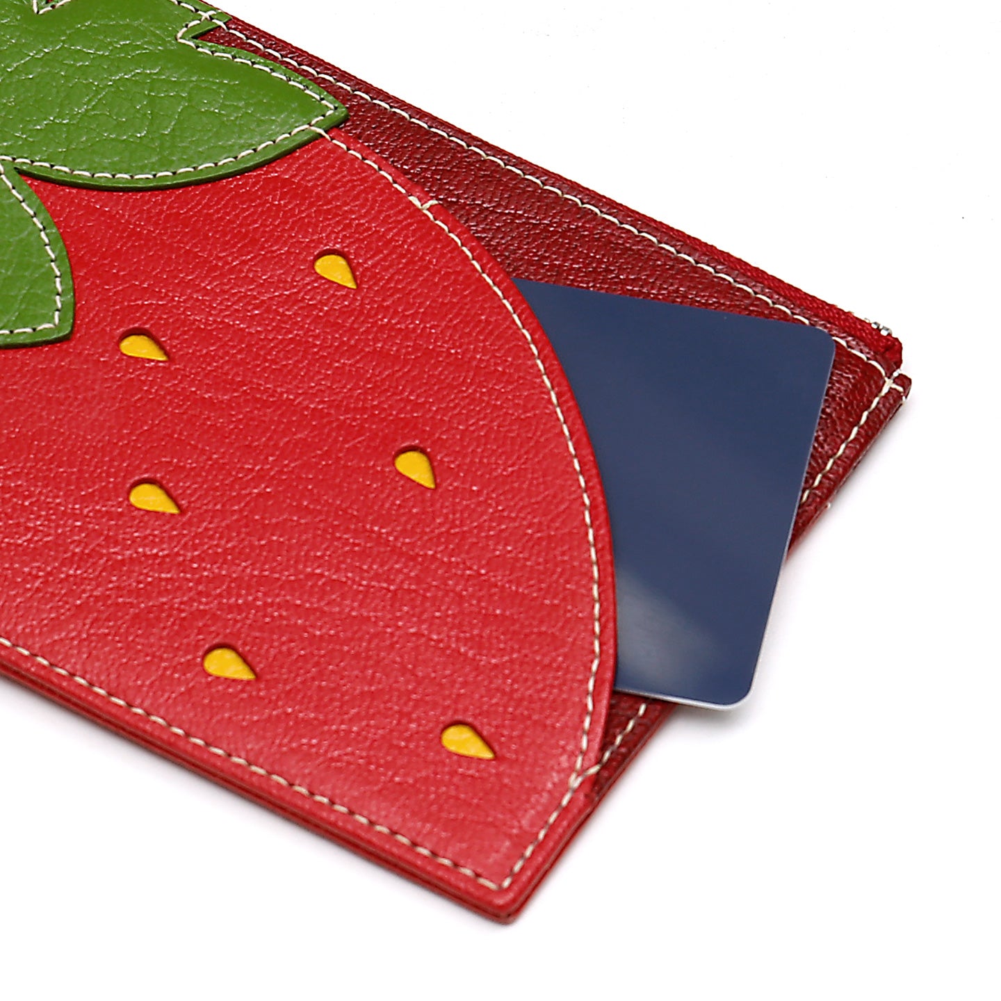 正面の半円フルーツモチーフ部分はカードが収納でき、 背面にも3枚のカードが収まるポケットが付いています。 ファスナーポケットには二つ折りにしたお札や小銭も収納できるので、ミニ財布としてもお使いいただけます。 薄いマチのあるデザインなので、鍵や細かなものなどの小物入れとしても活躍します。