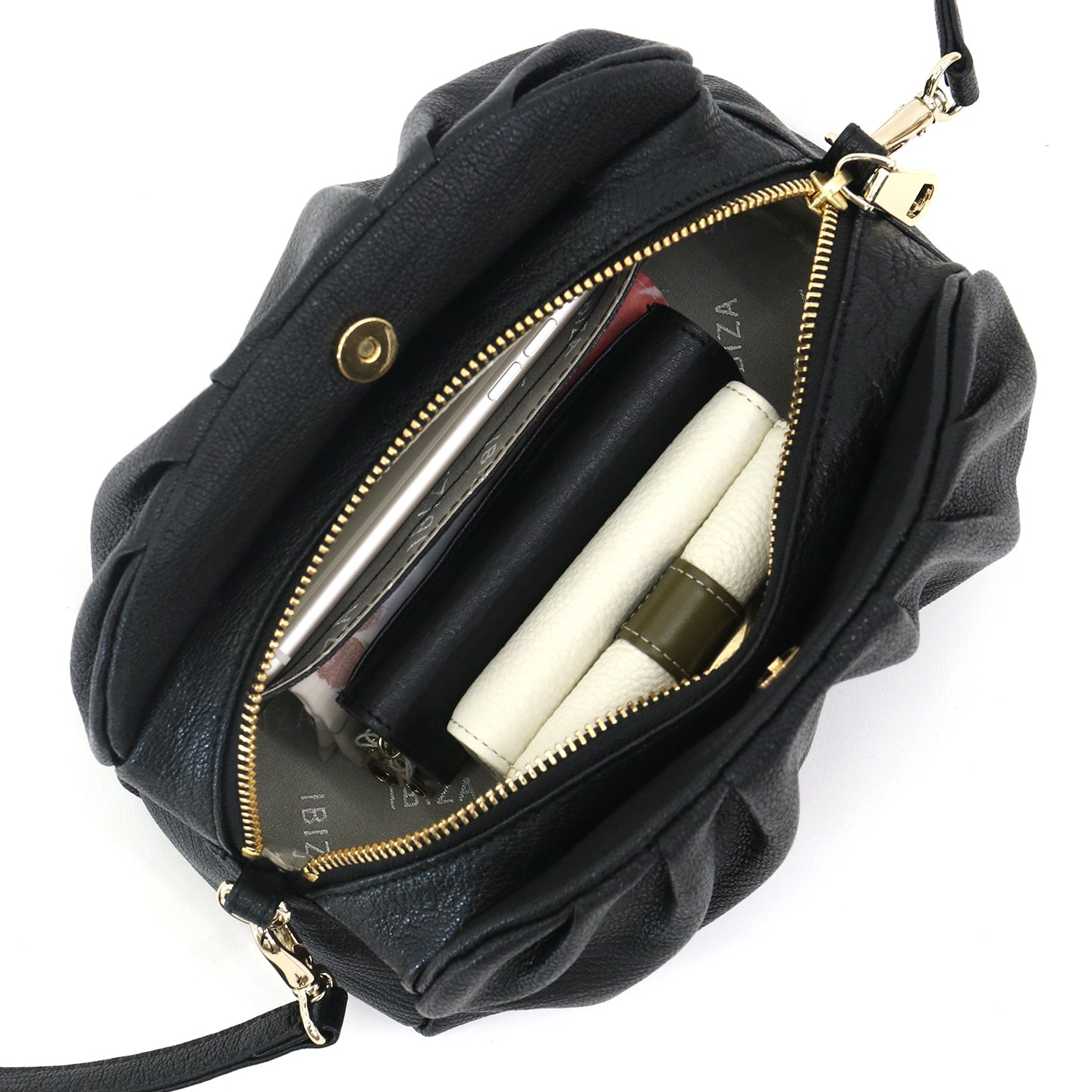 リップやコンパクトミラーなど小さいものをさっと収納できるあおりポケットを配しました。バッグの内側にはオープンポケットを2つ配置し、細かなものも散らからずに整理してお使いいただけます。コロンとしたフォルムがかわいらしく、小さめながらマチ幅があるので、貴重品もしっかりと収まります。