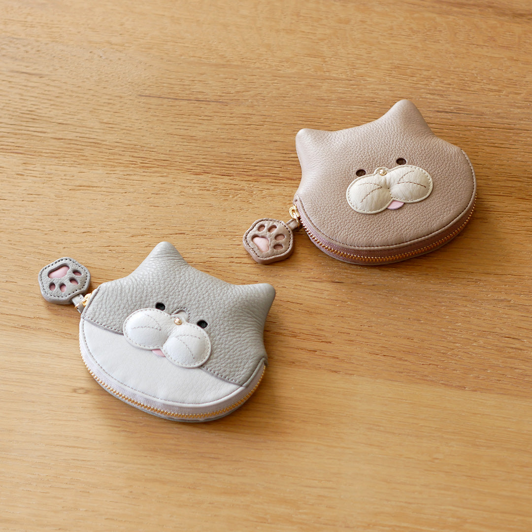 ぷっくりとした口元から小さな舌をのぞかせたとても愛らしい表情のねこ。片手に収まる程よいサイズ感で、コインケースとしてはもちろん、アクセサリーや鍵など大切な小物入れとしてマルチに活躍します。そして最大のポイントは、ファスナーの引手についた「ぷにぷにの肉球」チャーム。癒しと遊び心が詰まったアイテムです。