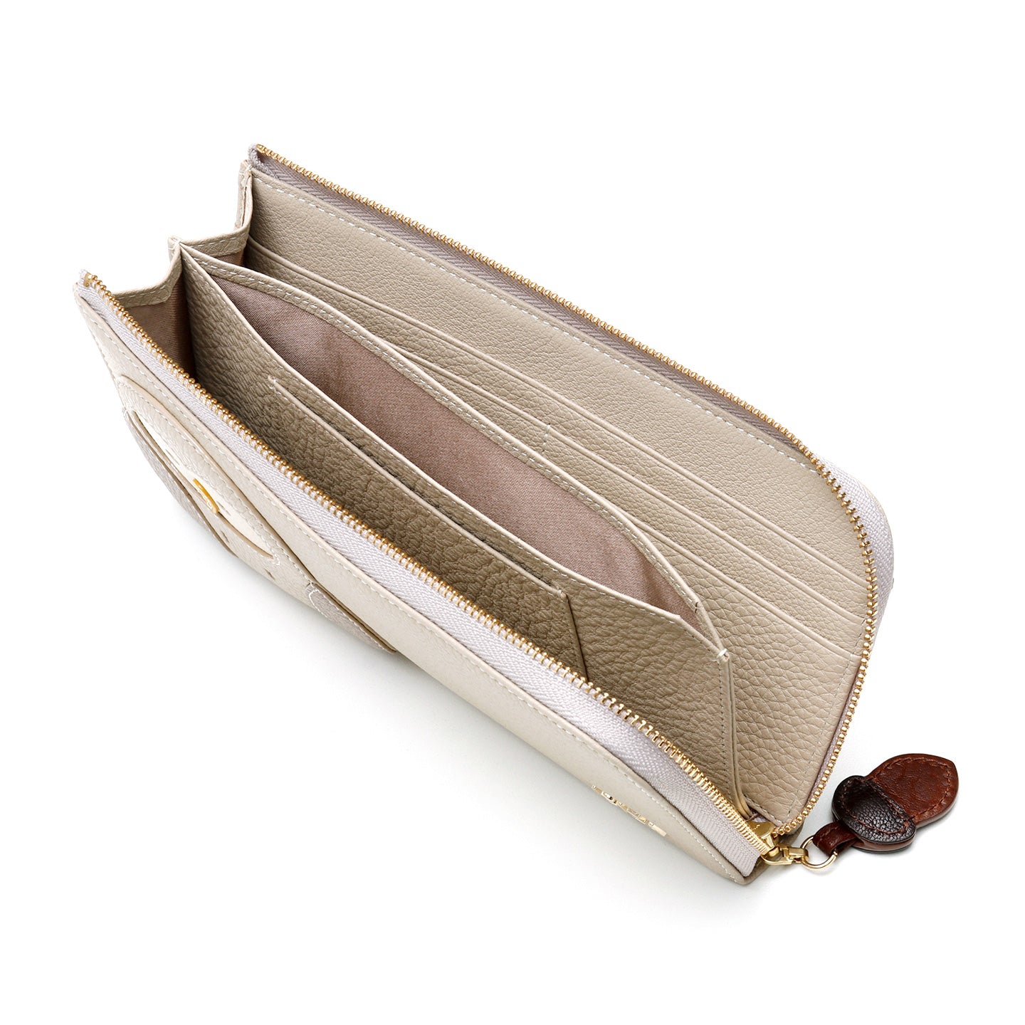 つぶらな瞳でこちらを見つめる、ころんとしたフォルムがかわいい子フクロウ。ちょこんとのぞく足がデザインポイントです。かわいさの中にも機能性を備えたL字ファスナー長財布は、開閉がスムーズで中身を一度に確認できます。カードポケットも充実しているので、とても使いやすく便利。引手はタンニン鞣しの牛革製で、使うほどどんぐりがツヤツヤに。アニマルモチーフも可愛らしさを全面に絶妙なバランスで配されています。