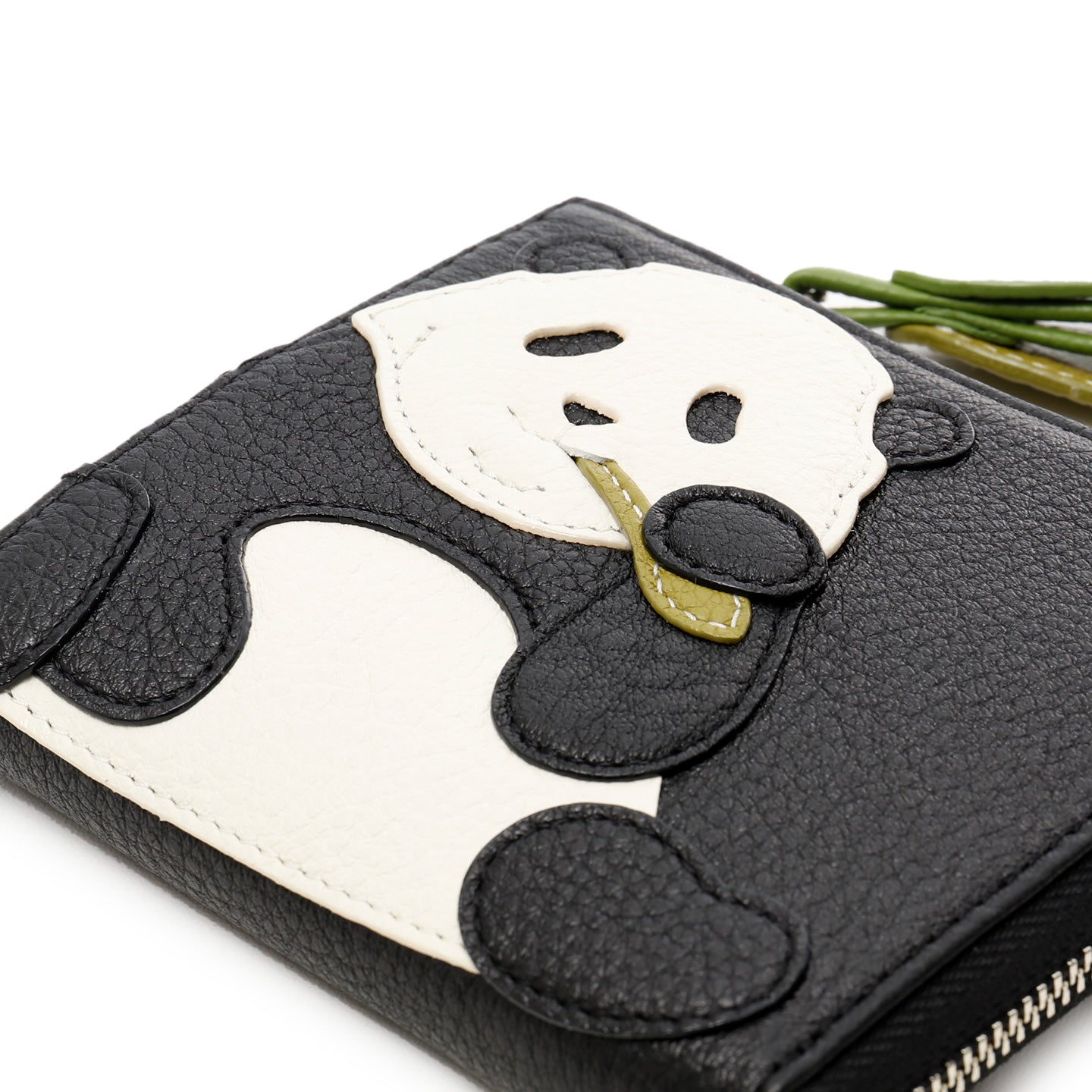 大好きな笹の葉をくわえながら、こちらを見つめるパンダ。たぷっとした二重あごがデザインポイントです。かわいさの中にも機能性を備えたL字ファスナー財布は、開閉がスムーズで中身を一度に確認できます。お札を折ってしまえるので、コンパクト財布として便利にお使いいただけます。引手にも大好物の笹の葉をつけ、遊び心のあるデザインに。アニマルモチーフも可愛らしさを全面に絶妙なバランスで配されています。
