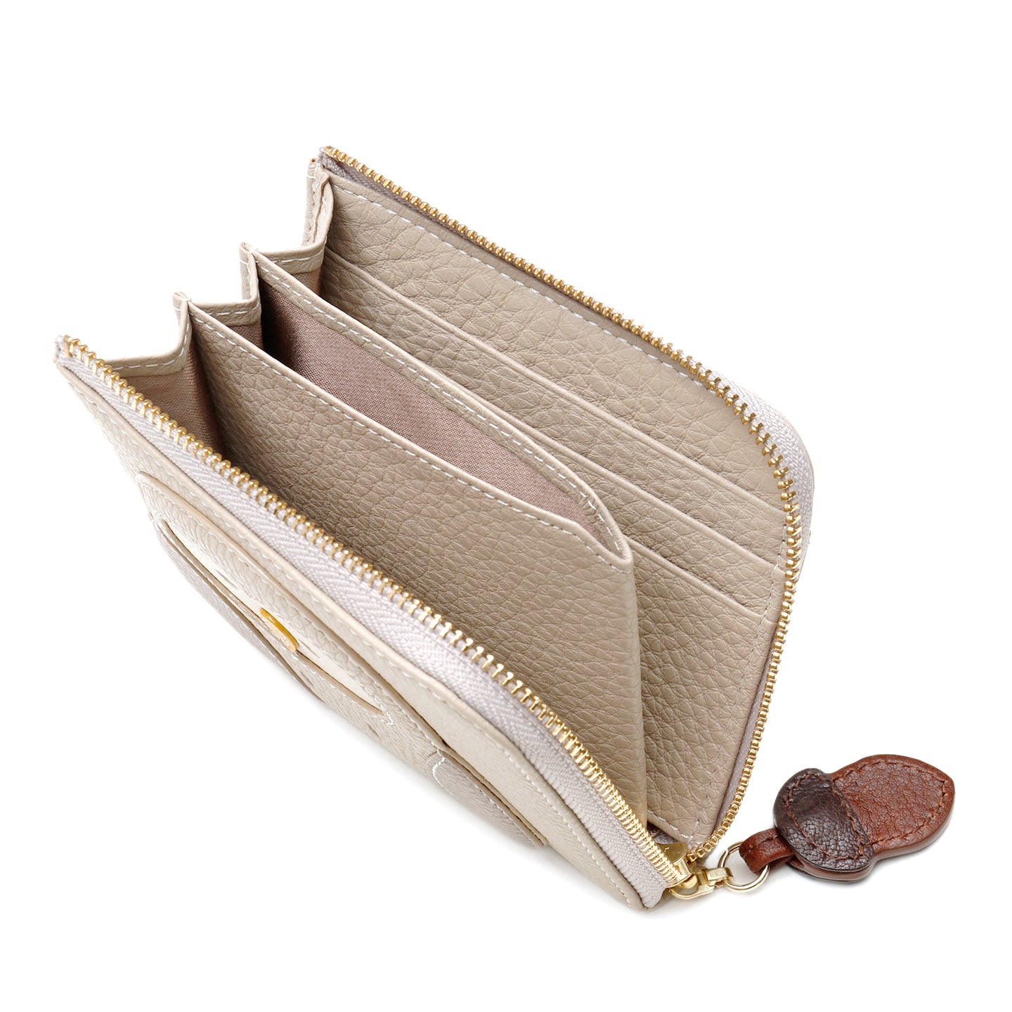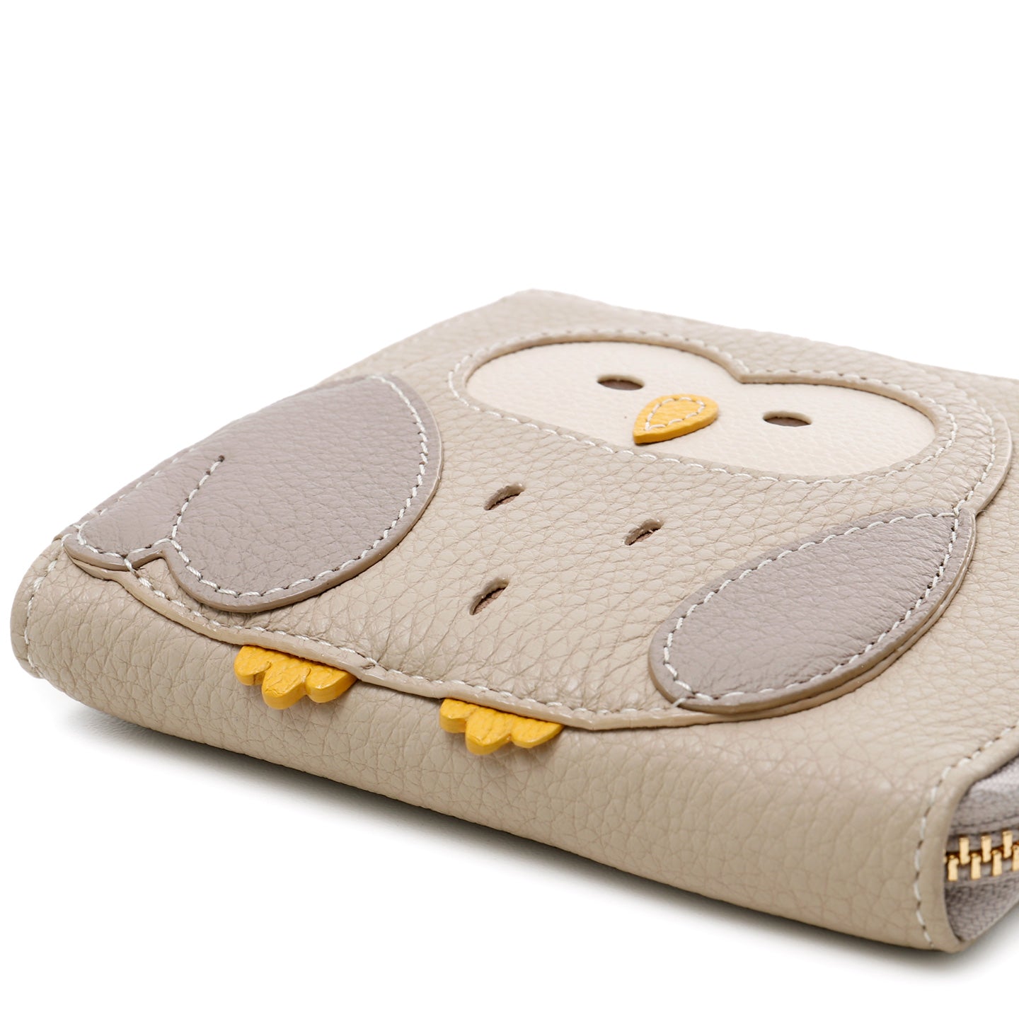 つぶらな瞳でこちらを見つめる、ころんとしたフォルムがかわいい子フクロウ。ちょこんとのぞく足がデザインポイントです。かわいさの中にも機能性を備えたL字ファスナー財布は、開閉がスムーズで中身を一度に確認できます。お札を折ってしまえるので、コンパクト財布として便利にお使いいただけます。引手はタンニン鞣しの牛革製で、使うほどどんぐりがツヤツヤに。アニマルモチーフも可愛らしさを全面に絶妙なバランスで配されています。