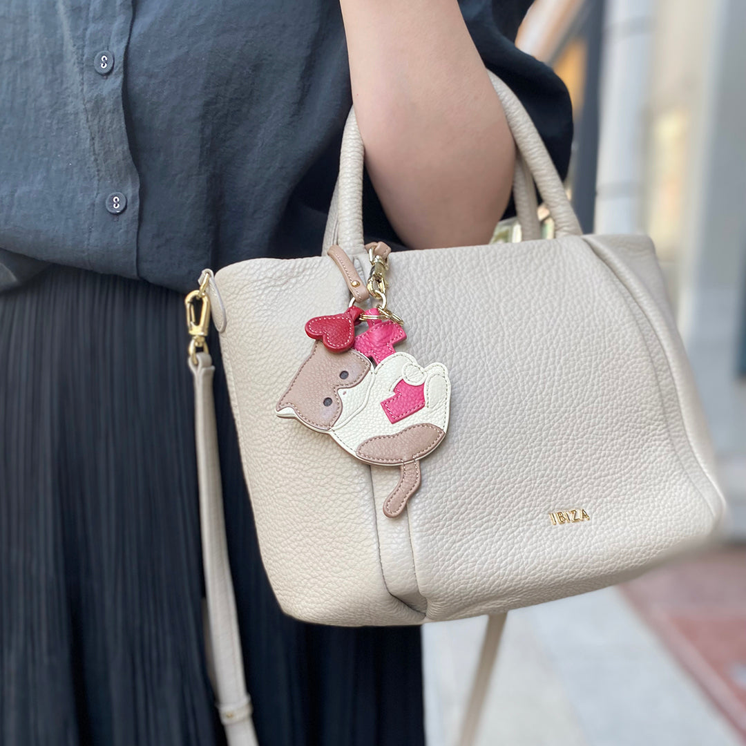IBIZAの頭文字『I』をおもちゃに見立て、つかまり遊びをするネコを表現しました。お手持ちのバッグに付けてバッグチャームとしてお楽しみいただける癒しアイテム。ふたつのキーリングが付いているので、キーチャームとしてもお使いいただけます。キーリングはネイルを傷つけないようやわらかめの二重リングを採用しました。自分へのご褒美はもちろん、大切な人への贈り物にもおすすめです。小さなハートに気持ちを込めて。