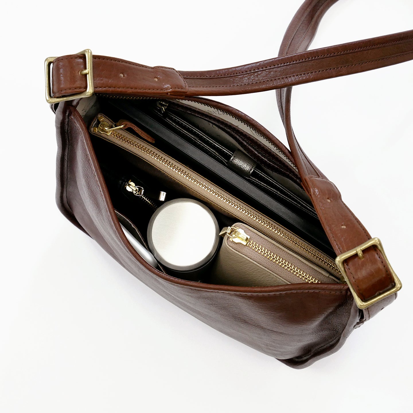 必需品を整理して持ち運べる、大きすぎず、小さすぎないショルダーバッグです。B5サイズまでのノートや長財布、350mlのドリンクボトルが入るメイン収納には2つのオープンポケットと貴重品が入るファスナーポケット付き。ファスナー開閉で中身をしっかりと守ります。