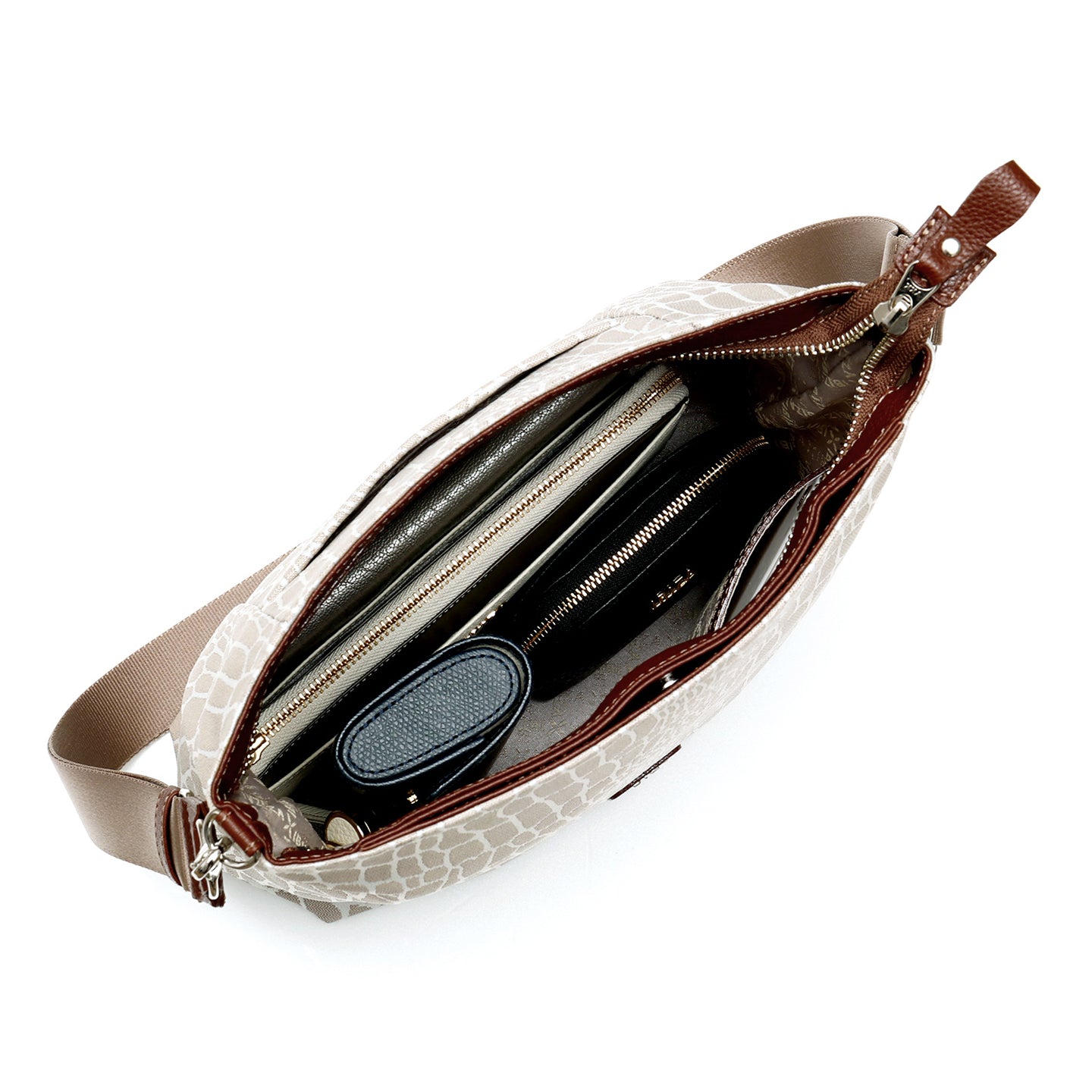 見た目の美しさだけでなく、快適に使える機能性にもこだわりました。メイン収納には仕切り付きの2つのオープンポケットと、貴重品の収納に便利なファスナーポケットを備え、小物をきちんと整理しやすい設計に。バッグの中がいつでもすっきり整い、必要なものをスムーズに取り出せます。