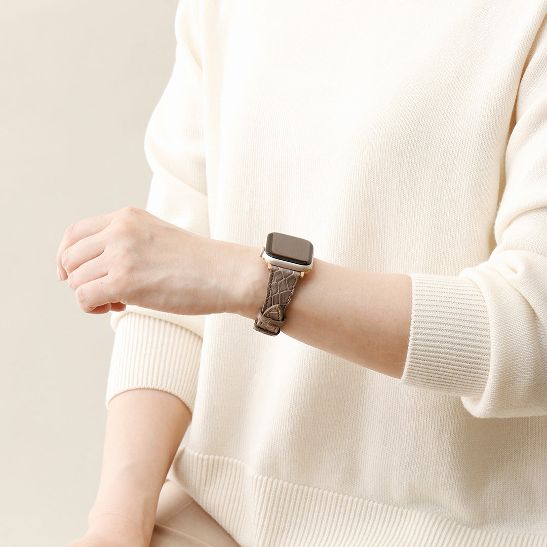 クロコダイルの中でも特に繊細な喉元(あご)部分を贅沢に使用し、優美なカーブを描くフォルムに仕立てたApple Watchバンド。女性の手元に自然になじむ、しなやかでエレガントなラインが魅力です。裏面には肌にやさしい牛革を採用し、心地よさと耐久性を両立。トープ、ワイン、ブラックのレザーと、4色の金具(アダプター/バックル)から、お好みの組み合わせをお選びいただけます。