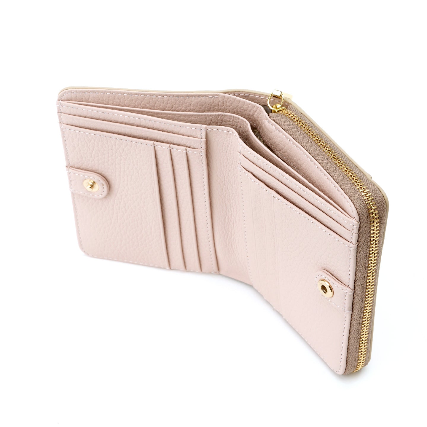 ラウンドファスナー式の小銭入れが付いた二つ折り財布。仕切りのついた札入れスペースや、充実したカードポケットで機能性を備えています。背面には、よく使うカード類をさっと取り出せるオープンポケットを配置。小銭入れ部分は大きく開き、中央に仕切りがあるので、しっかりと仕分けができる使いやすいデザインです。