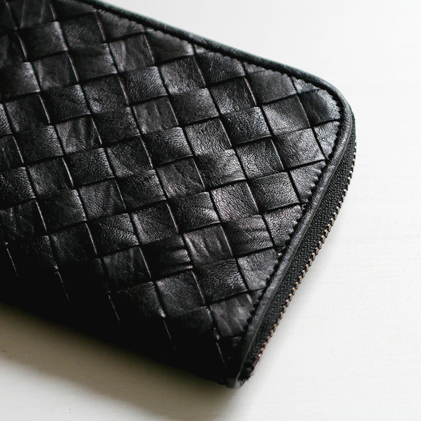 細い革紐で一本一本きれいに編みあげるのはまさに職人技。革の表情や微妙な色の変化が織り成すデザインは飽きがきません。素材の良さを肌で感じることができ、時を重ねるほど表情豊かになる経年変化を存分にお楽しみいただけます。