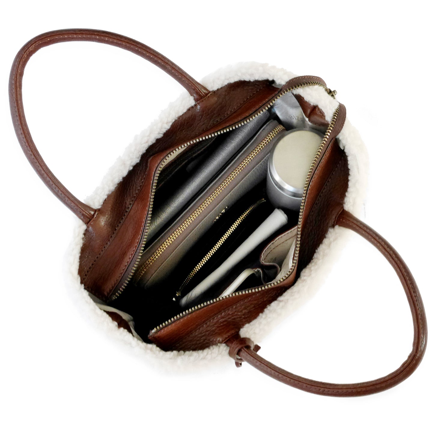 ファスナーを開けたままでもオープンタイプとしてお使いいただける、落としファスナー仕様です。内側には2つのオープンポケットと貴重品の収納に便利なファスナーポケットを配しました。広めのマチ幅なので、長財布はもちろん、小さめポーチやドリンクボトルなど、お出かけに必要な物がしっかり収まります。使う人、使うシーンを考え抜いたかたちです。