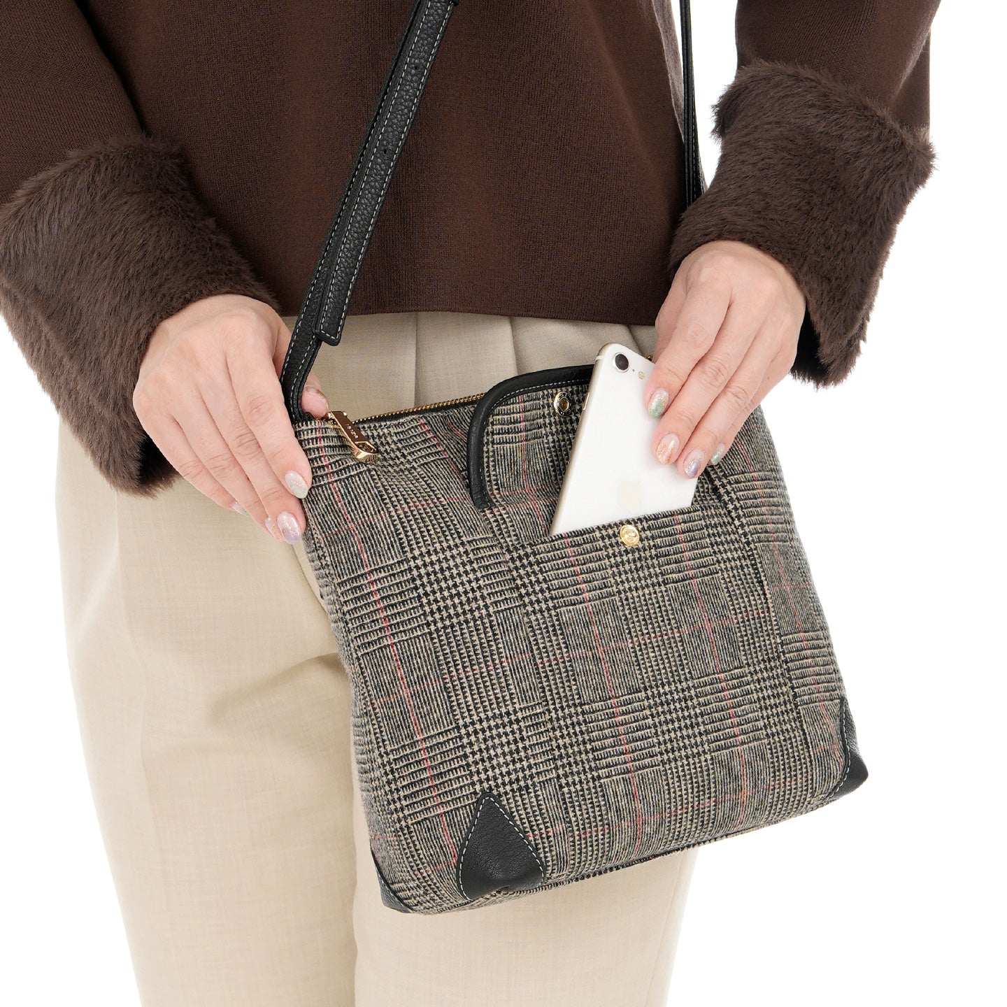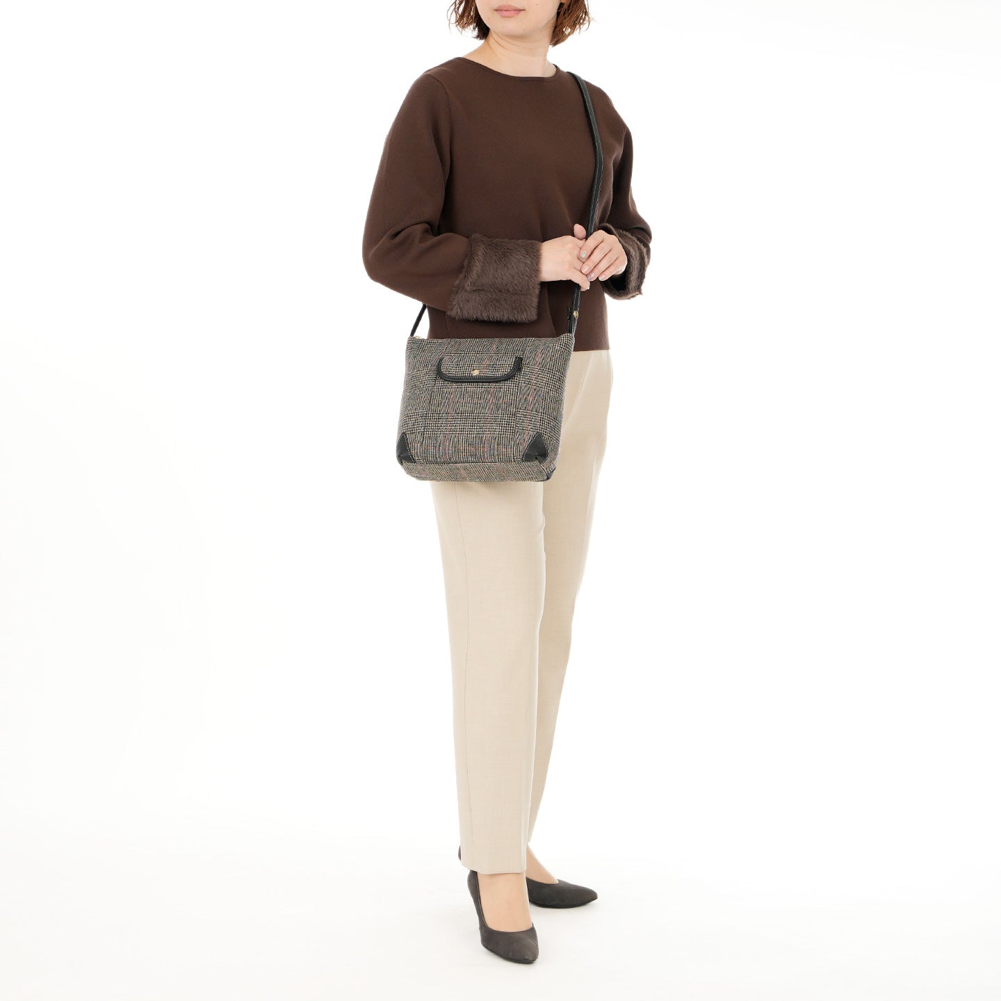 クラシカルなチェック柄とシュリンクレザーの組み合わせが上品な雰囲気で、オフィススタイルからカジュアルスタイルまで幅広くお使いいただけます。