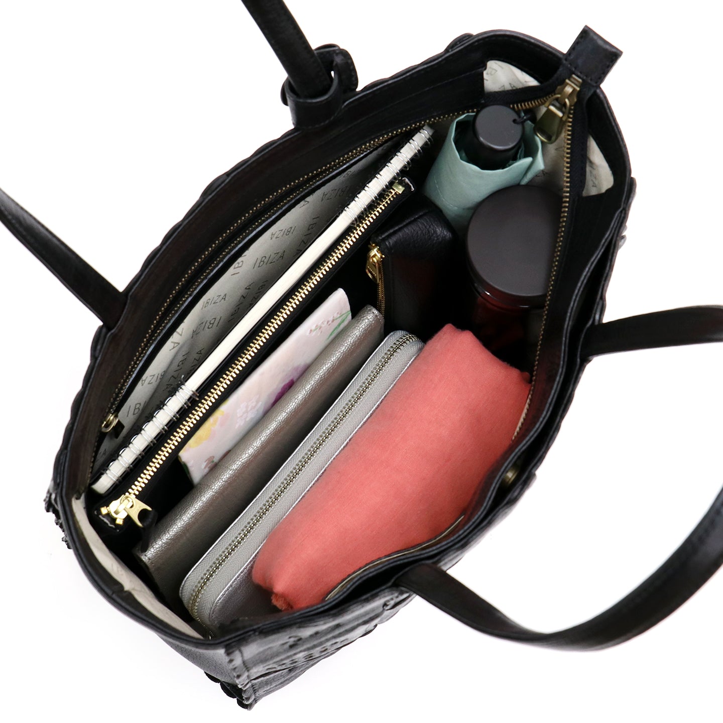 ビスケットのような愛らしさのカットワークレザー。花弁をイメージしたアウトラインとIBIZAオリジナルのレースのようなカッティングを施したパーツを職人が手縫いで仕上げています。植物タンニン鞣しの革は傷が付きにくく使うほどに色味や艶が増し表情が豊かに。自分だけのバッグに育てる楽しみと喜びを感じていただけます。