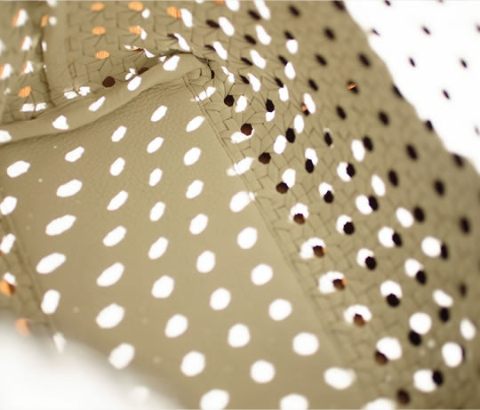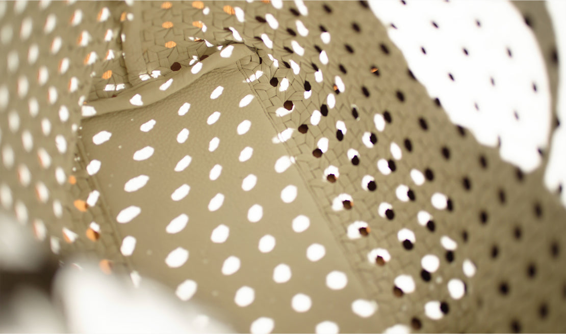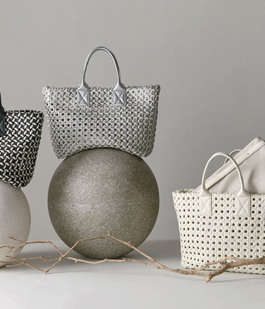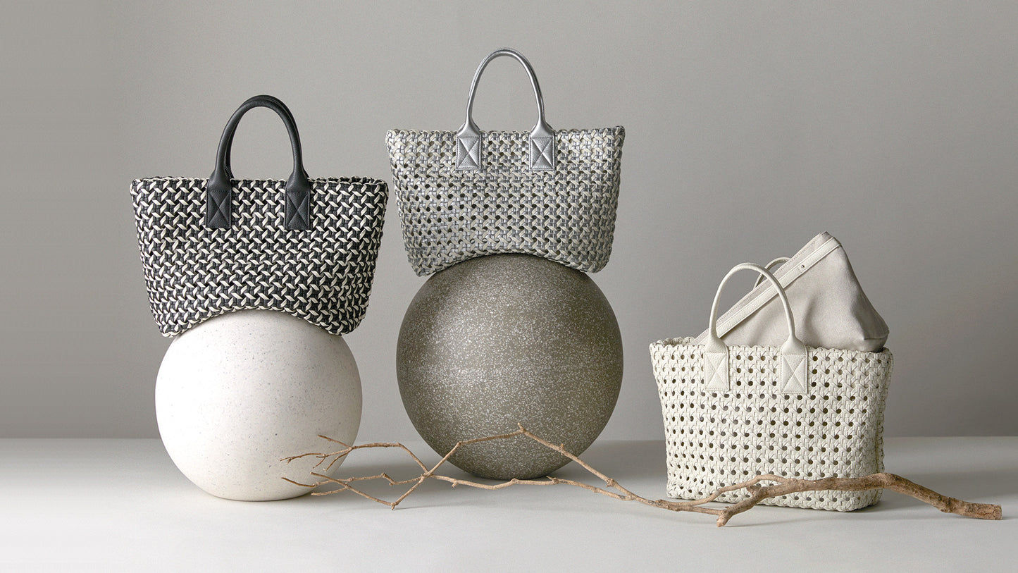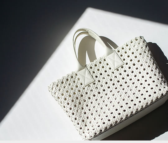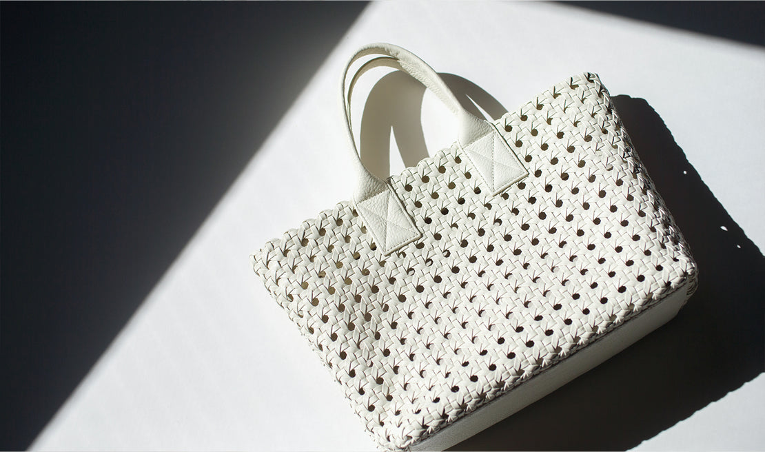 2022年のアルテサニーアは、北米産の牛革のやわらかい素材感と馴染みの良いエレガントな印象を与えるモノトーンの配色。光の透け感が季節のスタイリングを涼し気に演出します。かごバッグのような軽やかさを取り入れながら、革の魅力を楽しみたいという人に持ってもらいたいバッグです。