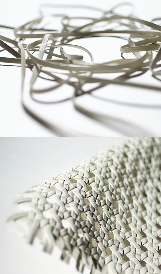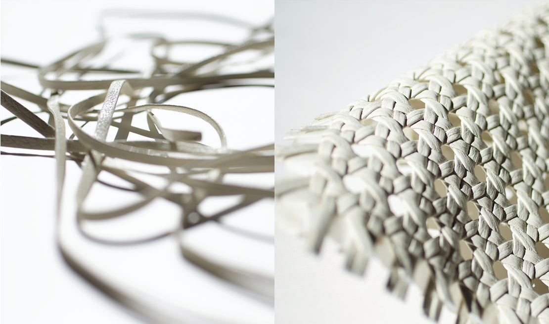 透け感のあるかごバッグというイメージを形にしていく中で、最大のトピックスは竹細工にヒントを見出したこと。デザイナーは自らさまざまな革紐を編むことを繰り返して検証を重ね、竹細工の技法の「八目編み」という結論にたどり着きました。