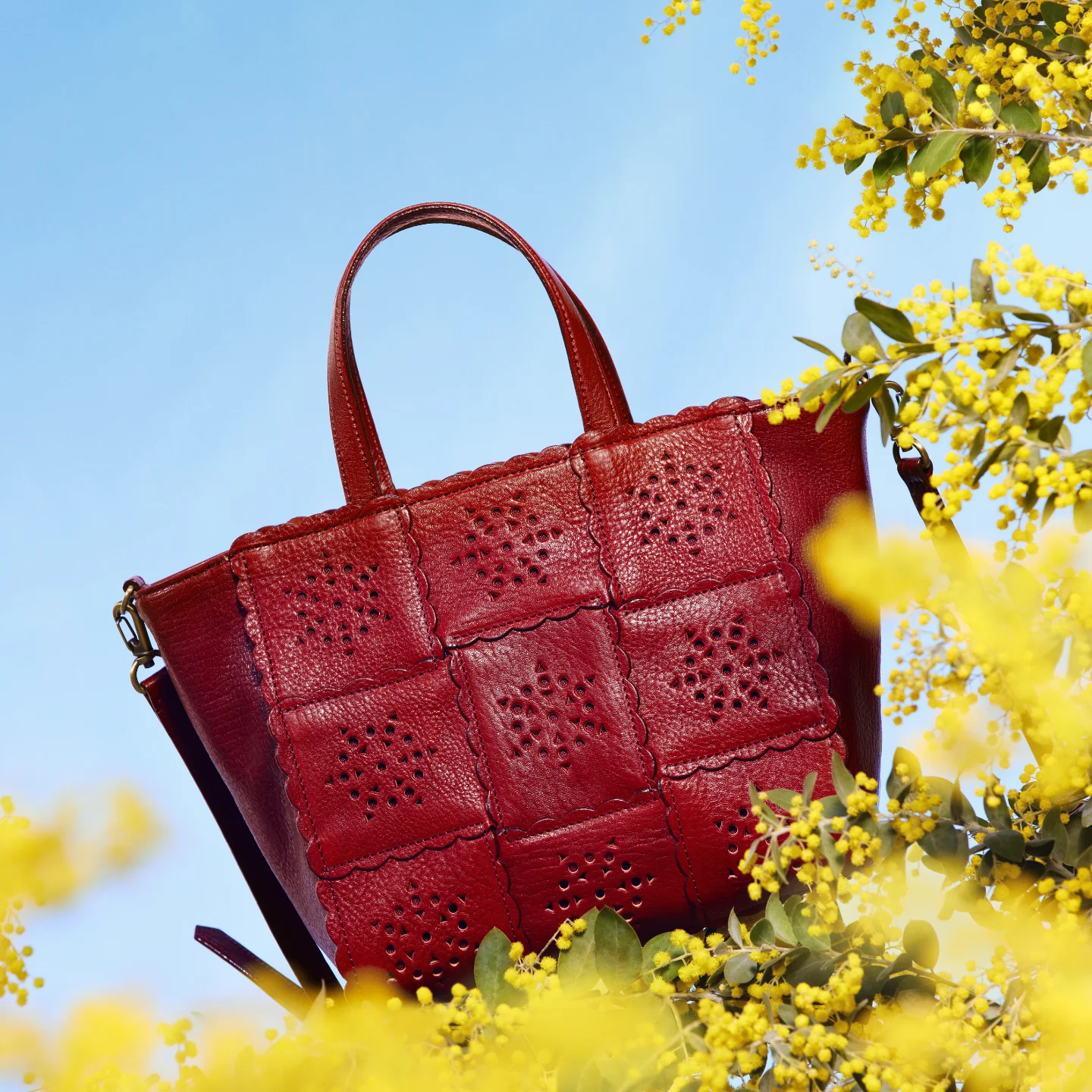 まずは柄のデザインを起こして精査し、選び抜いたものを厚紙に写してカット。花の可愛らしさや華やかさが表現できるまで試行錯誤しました。次いで製品と同じ素材の革を使って、全体のバランスを見ながら何度も微調整を繰り返しています。そして実際の重なり具合を確認し、ようやく一つのバッグに実を結んでいます。