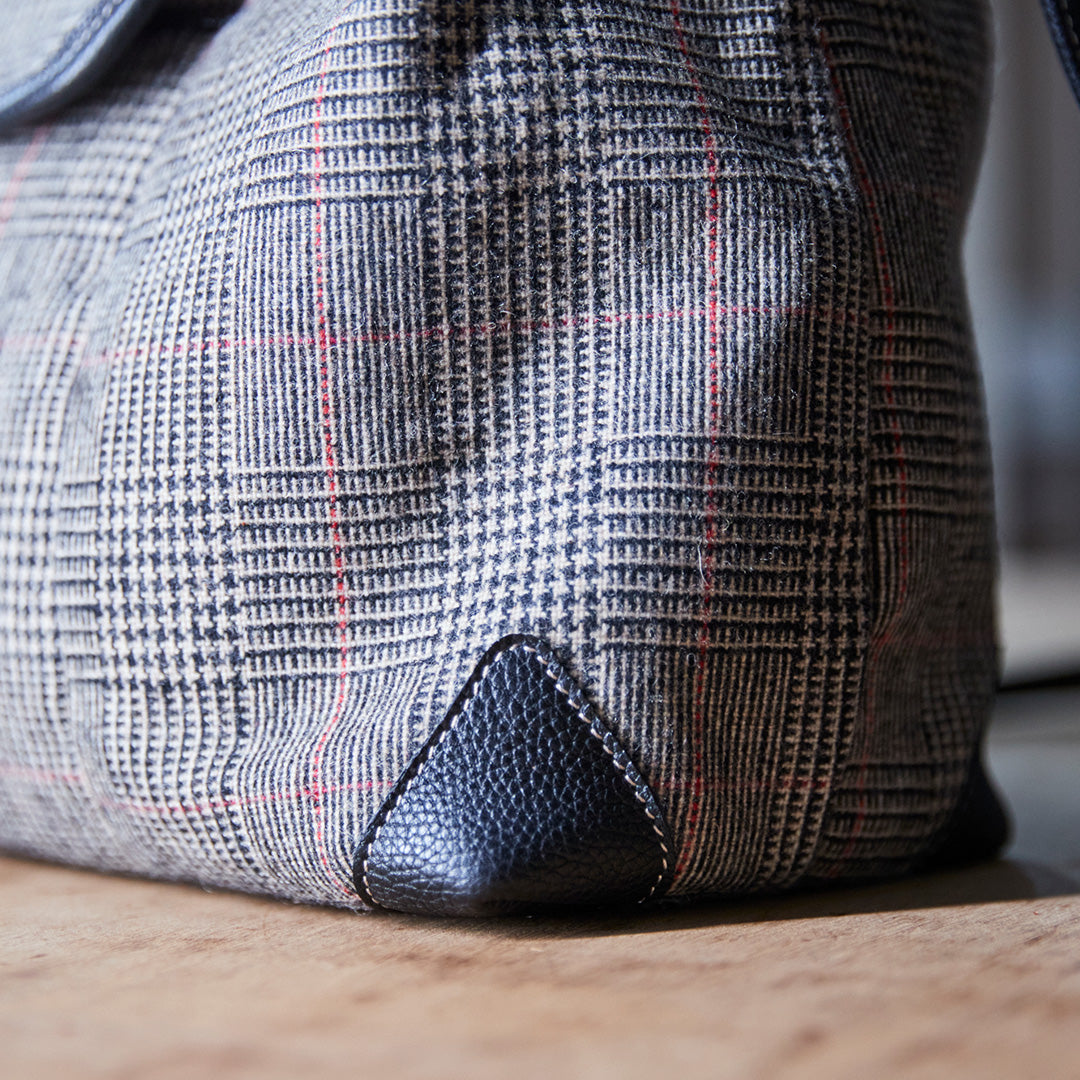 このバッグの底部のコーナーには小さなレザーを配していますが、これはデザインから発想されたのではありません。ウールは擦れたらリペアできないため、もっとも擦れやすいコーナー部分にレザーを配することで、補強するだけでなく同時にレザー部分だけを取り替えれば長く使えるのです。