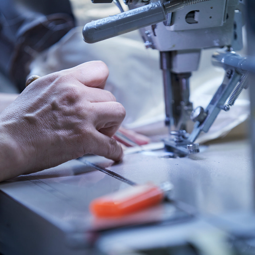 クラシックをベースにしたブロックチェックに続き、2022年のコレクションから少しシックなグレンチェックを展開。さらに進化させたポイントが二つあります。一つ目はイビサに求められる温もりを表現するために、スクエアな角のある縫い方から袋縫いを取り入れ、やさしい丸みを演出した点。二つ目はポケットのレザー使いもより軽やかにパイピングでポケットの開閉をしやすくアップデート。レザーを細いパイピングで一律縫う作業はかなり神経を使うものですが、熟練の技で繊細な仕上がりを実現しました。