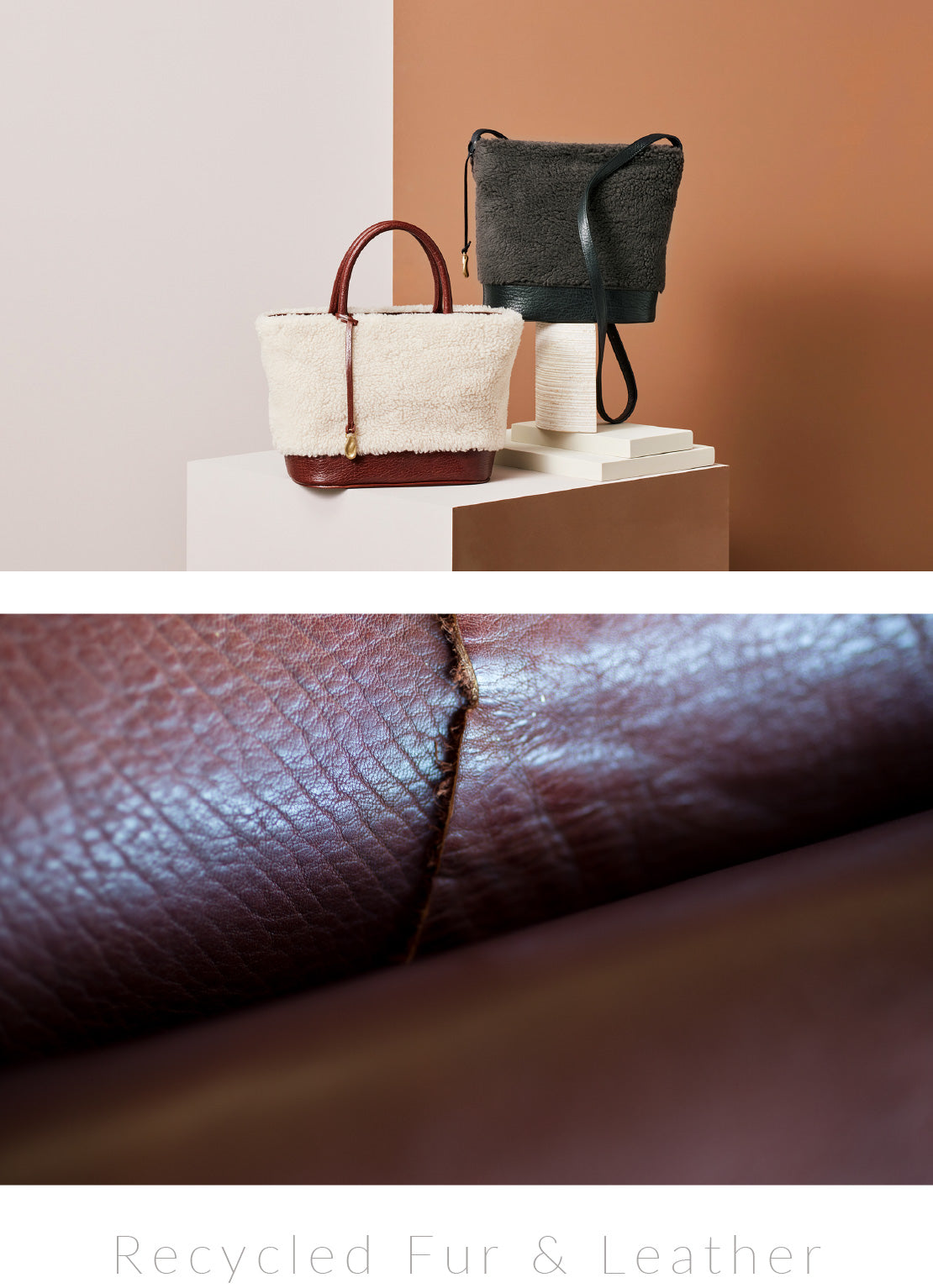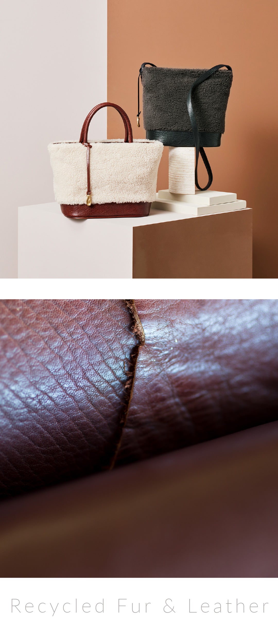 ふんわりとしたリサイクルファー(ボア)と、ベジタブルタンニンレザーを組み合わせて。