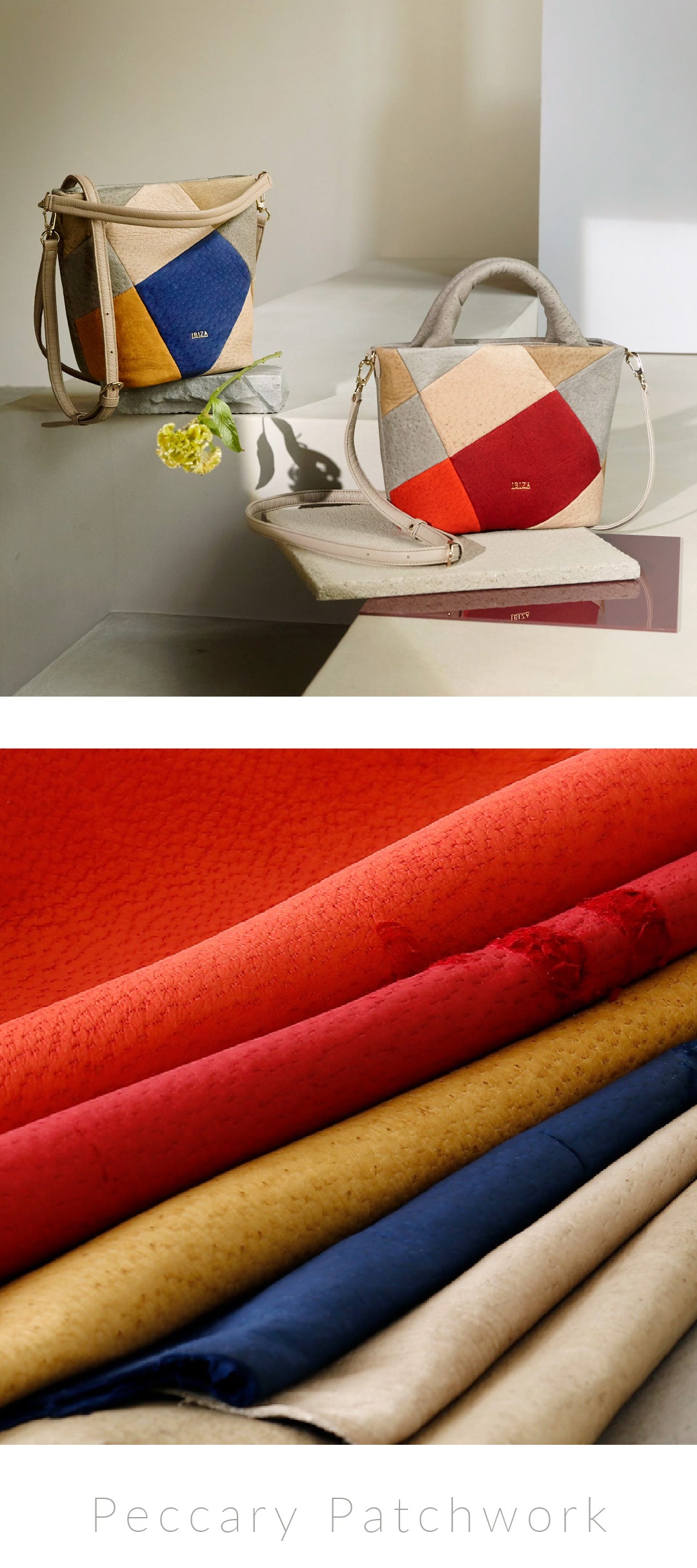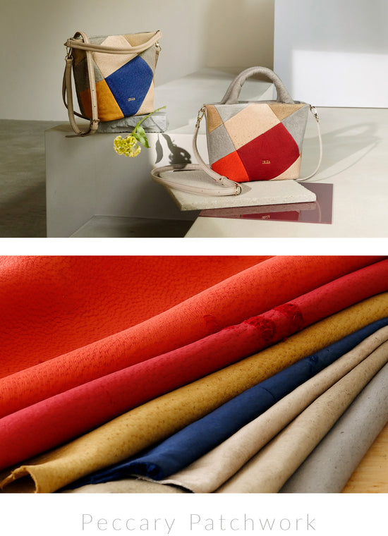 柔らかく手に吸いつくようなペッカリーレザー。色や風合いの異なるパーツをひとつひとつ丁寧に組み合わせ、職人の技が光るパッチワークに仕立てました。