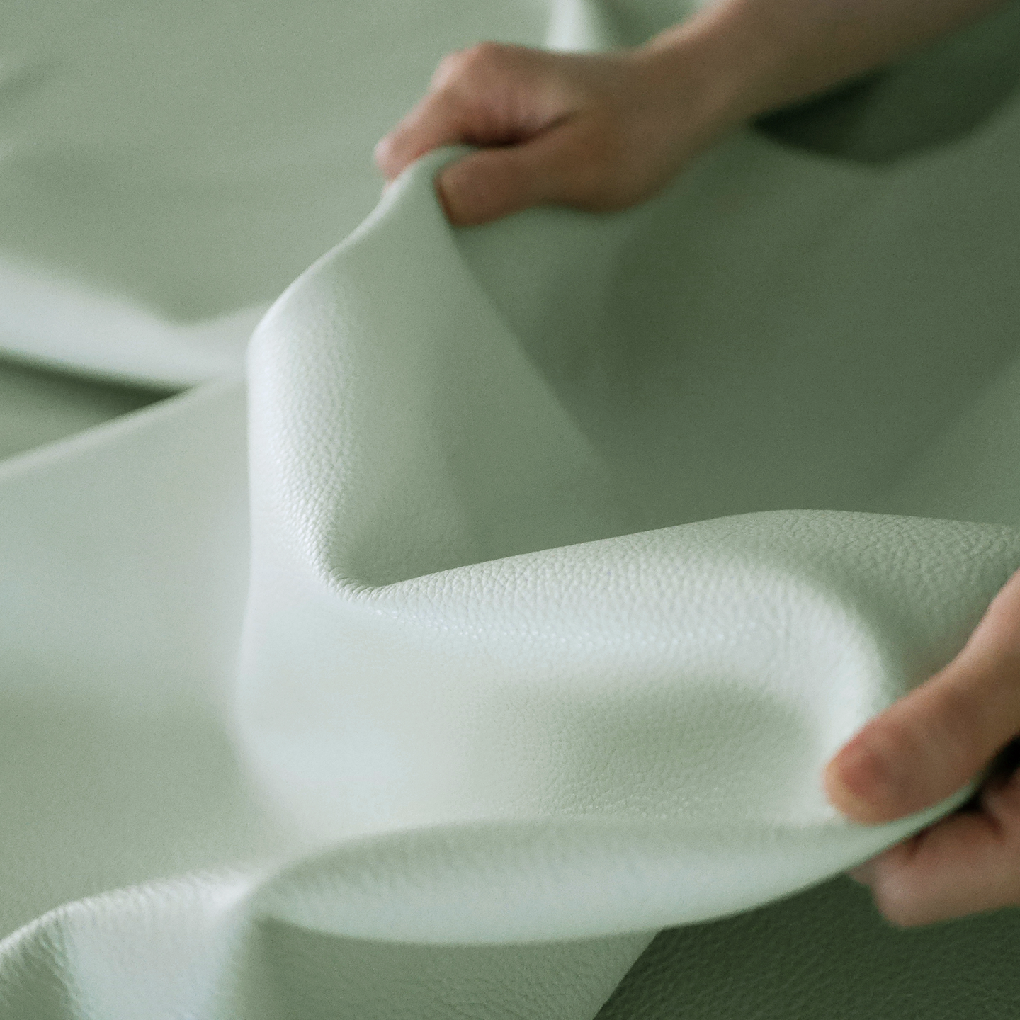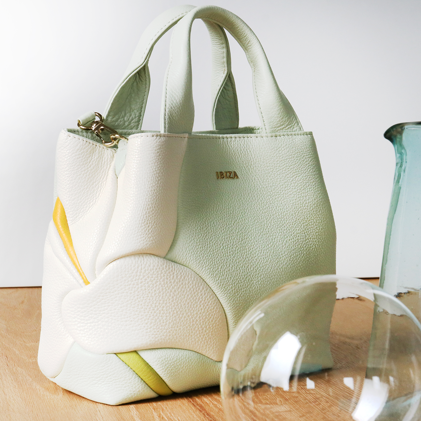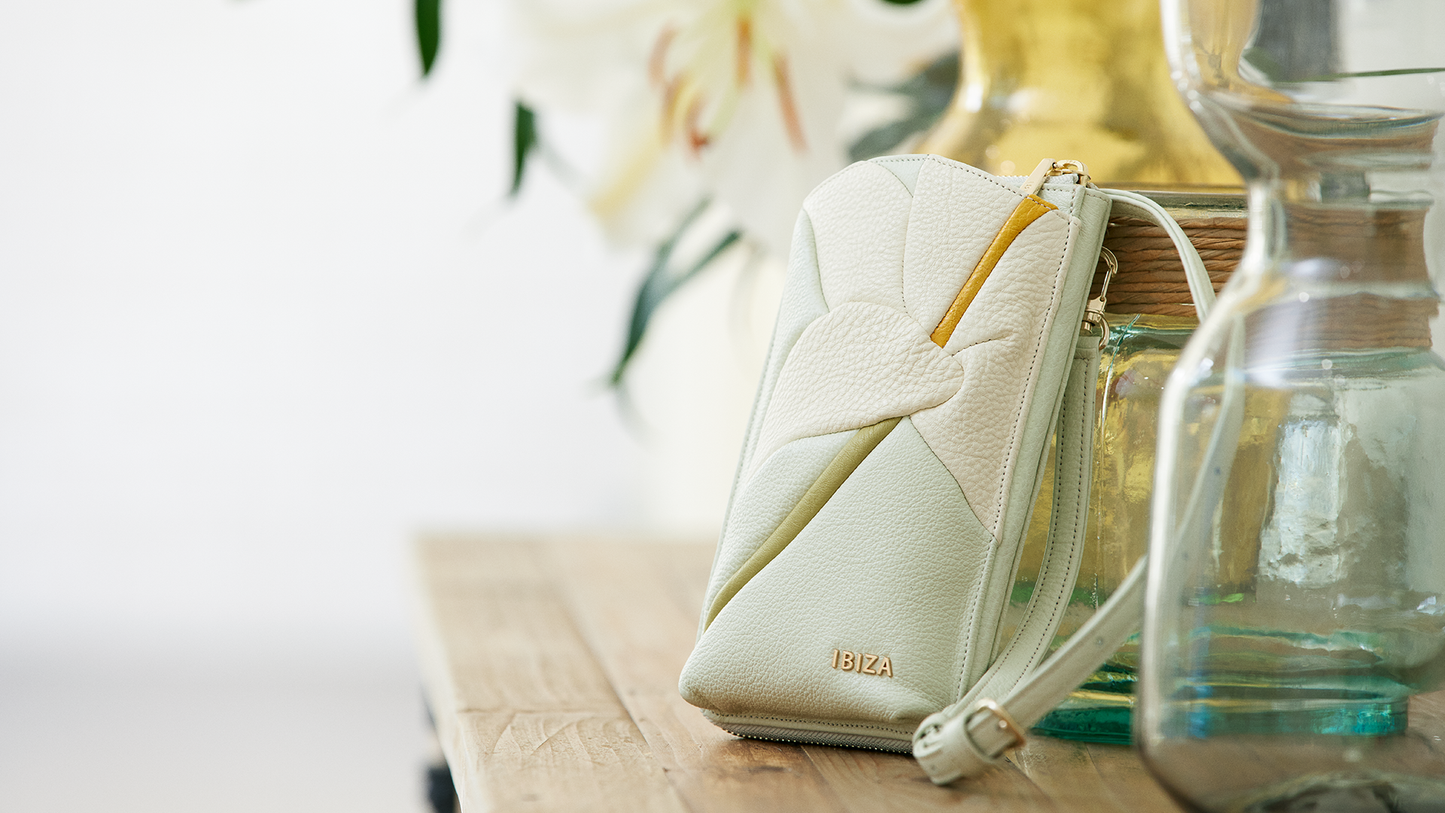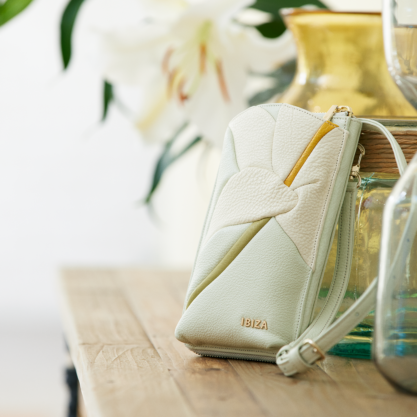 花モチーフを一層やわらかな表情にしてくれているのが、上質な北米産のシュリンクレザーです。⾁厚でふっくらとしたソフトな⼿触りや、素材感のある程よいナチュラルなシボが、イビサのオリジナルカラー「ペールグリーン」とあいまってより優美な印象を演出してくれます。汚れや傷も目立ちにくいので、長くご愛用いただけます。
