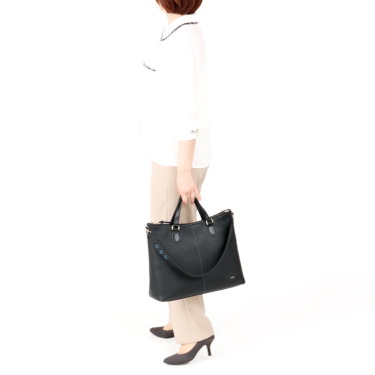 肩にかけたとき自然と身体にフィットするムルティプレシリーズ。デザインポイントのメッシュが施されたワンショルダータイプのストラップは取り外し可能なので、その日のスタイルや気分によって持ち方を変えられる2WAYタイプです。ハンドルは倒れる仕様になっているので、肩にかけても邪魔にならず便利にお使いいただけます。ベーシックなブラックは、オフィススタイルにも最適です。