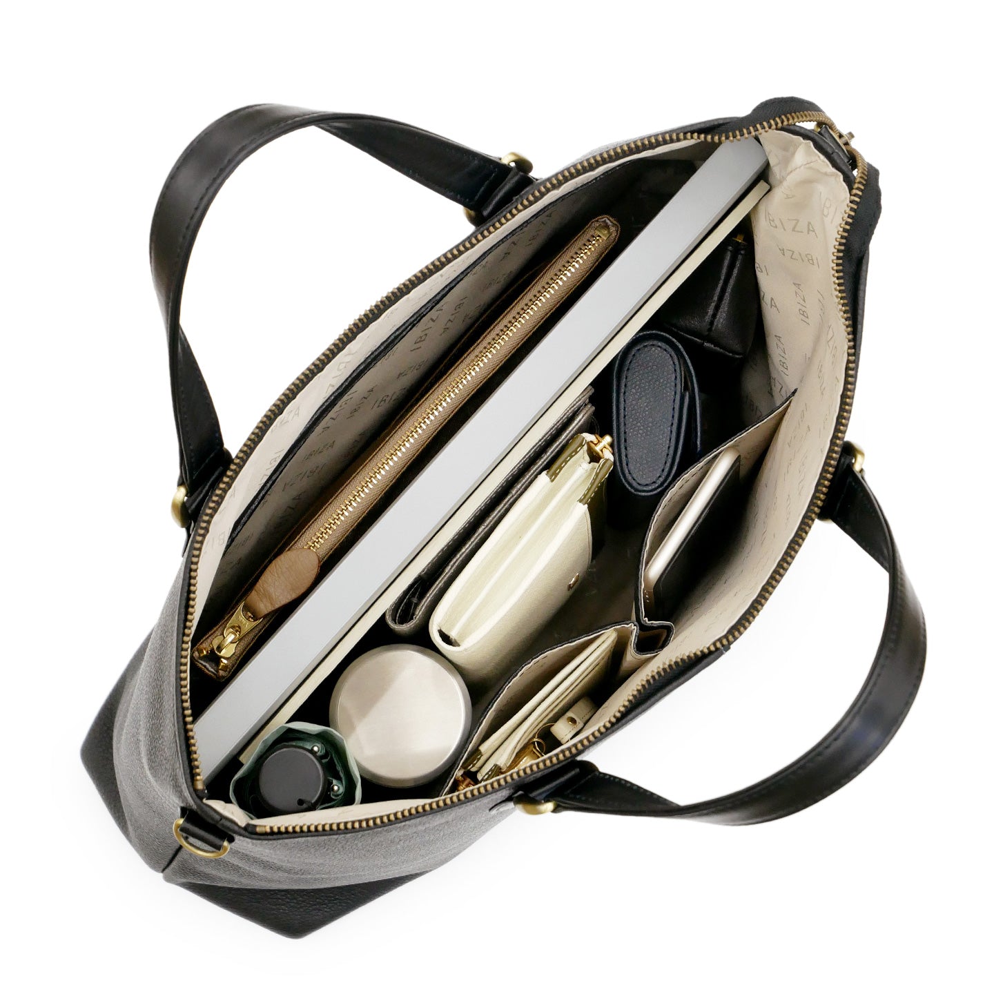大きめサイズの2WAYバッグは、A4サイズがしっかり収まるので、荷物が多くなりがちなビジネスシーンにもぴったり。内側には、細かなものの整理に便利なオープンポケットとファスナーポケットがついています。外側のオープンポケットには、スマホやパスケースなど、よく使うものを収納いただけます。レザーが施されたファスナーの引手は手に取りやすく、緩やかなカーブに沿って開閉もスムーズに行なえます。