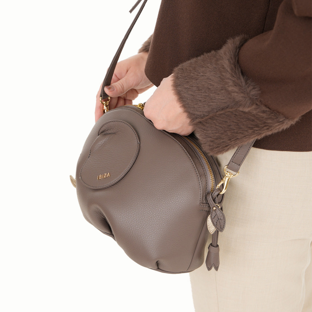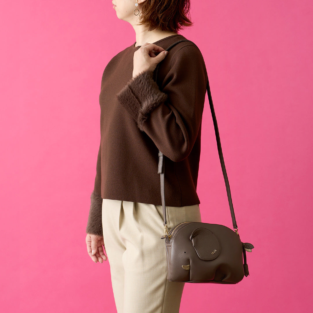 内装はゾウの足部分に荷物が入らない設計で、型崩れを防ぎながらすっきりと収納できます。お出かけの必需品がほどよく収まり、見た目のかわいらしさと実用性を兼ね備えたショルダーバッグです。