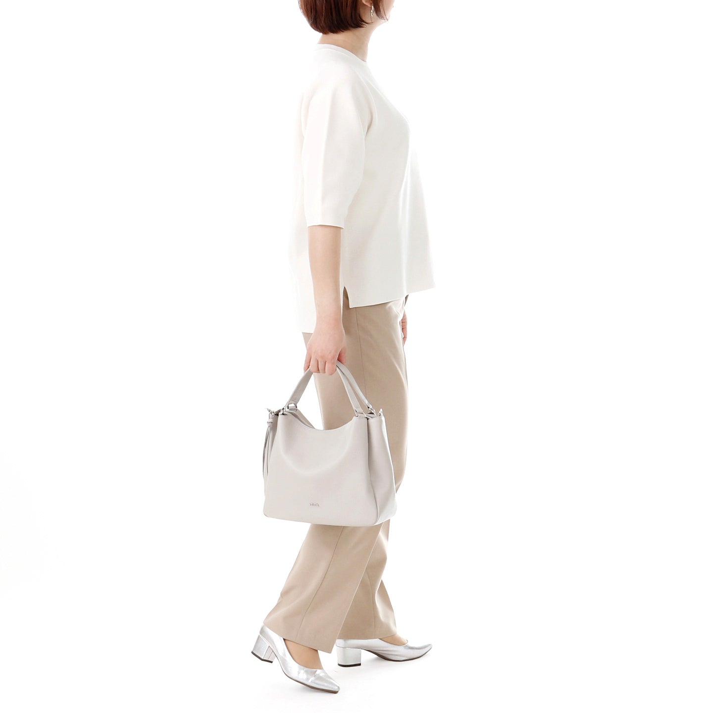 ショルダー紐は取り外しできるので、その日の装いやシーンに合わせて、肩掛けや手持ちなど、気分に合わせた持ち方が楽しめます。ハンドルはふっくらと丸みを持たせ、手にやさしくなじむだけでなく、長時間持っても手が痛くなりにくい仕様に。ベーシックなスタイルに、やわらかなフォルムと金具使いがさりげないアクセントを添え、シンプルすぎず大人の装いにほどよく馴染むデザインに仕上げました。