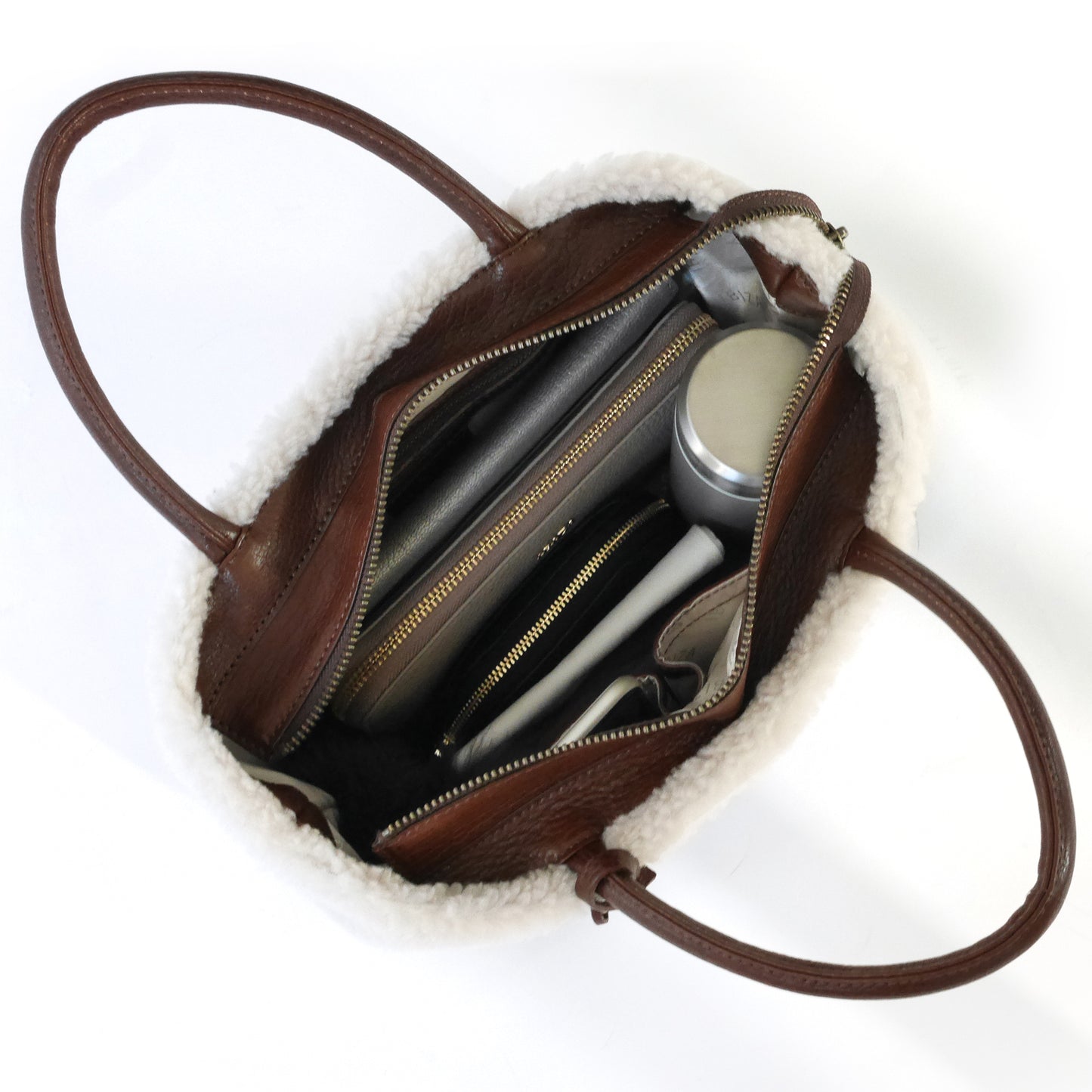 ファスナーを開けたままでもオープンタイプとしてお使いいただける、落としファスナー仕様です。内側には2つのオープンポケットと貴重品の収納に便利なファスナーポケットを配しました。広めのマチ幅なので、長財布はもちろん、小さめポーチやドリンクボトルなど、お出かけに必要な物がしっかり収まります。使う人、使うシーンを考え抜いたかたちです。