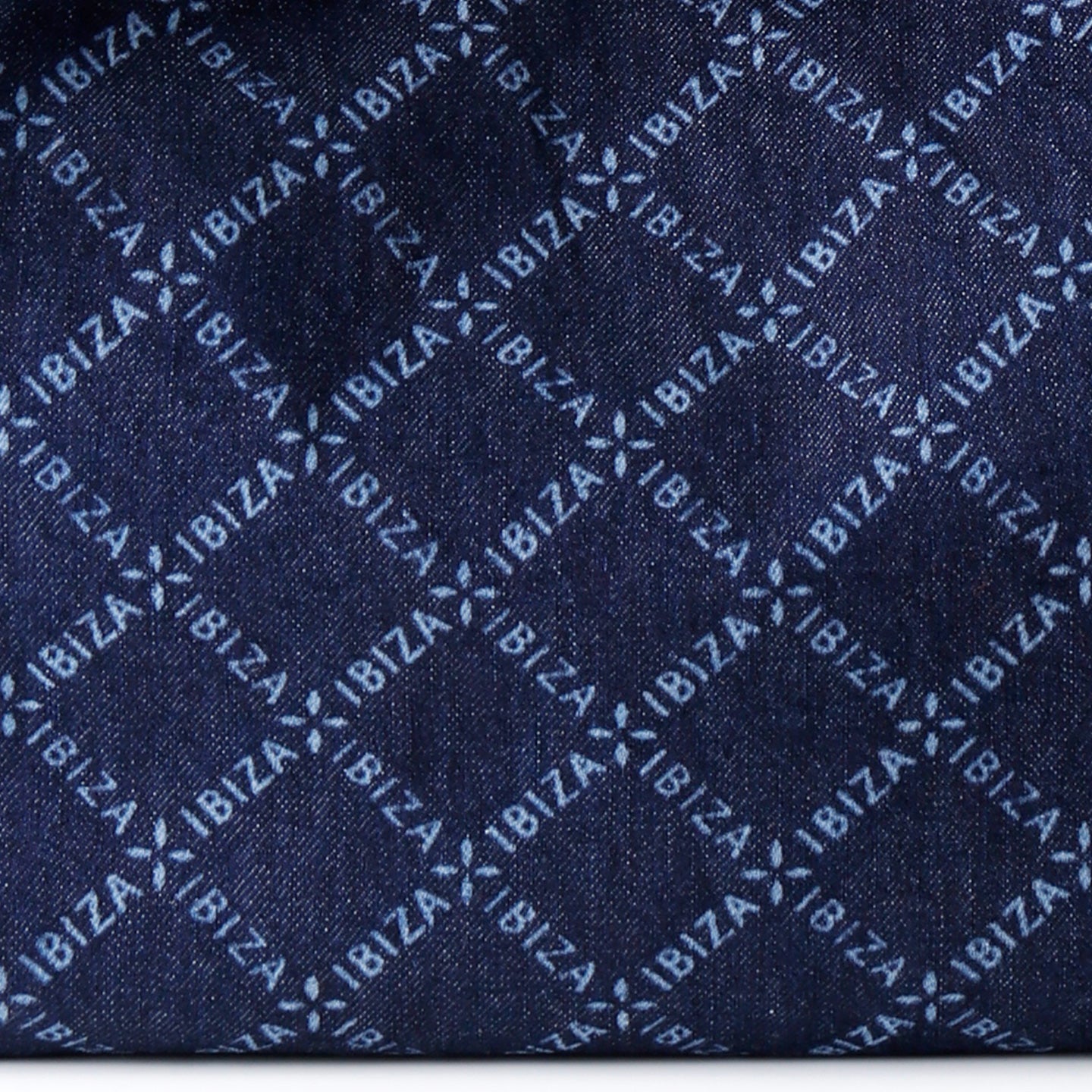 イビサロゴのチェック柄とオリーブの花のモノグラムをあしらった、岡山県産のオリジナルデニム。手触りのやわらかさと軽さが魅力で、使い始めから自然と馴染む素材です。また、従来のデニム加工に比べて環境にやさしい、エコな加工方法としても注目される「レーザー加工」を採用することで、繊細で奥行きのある模様を表現しました。